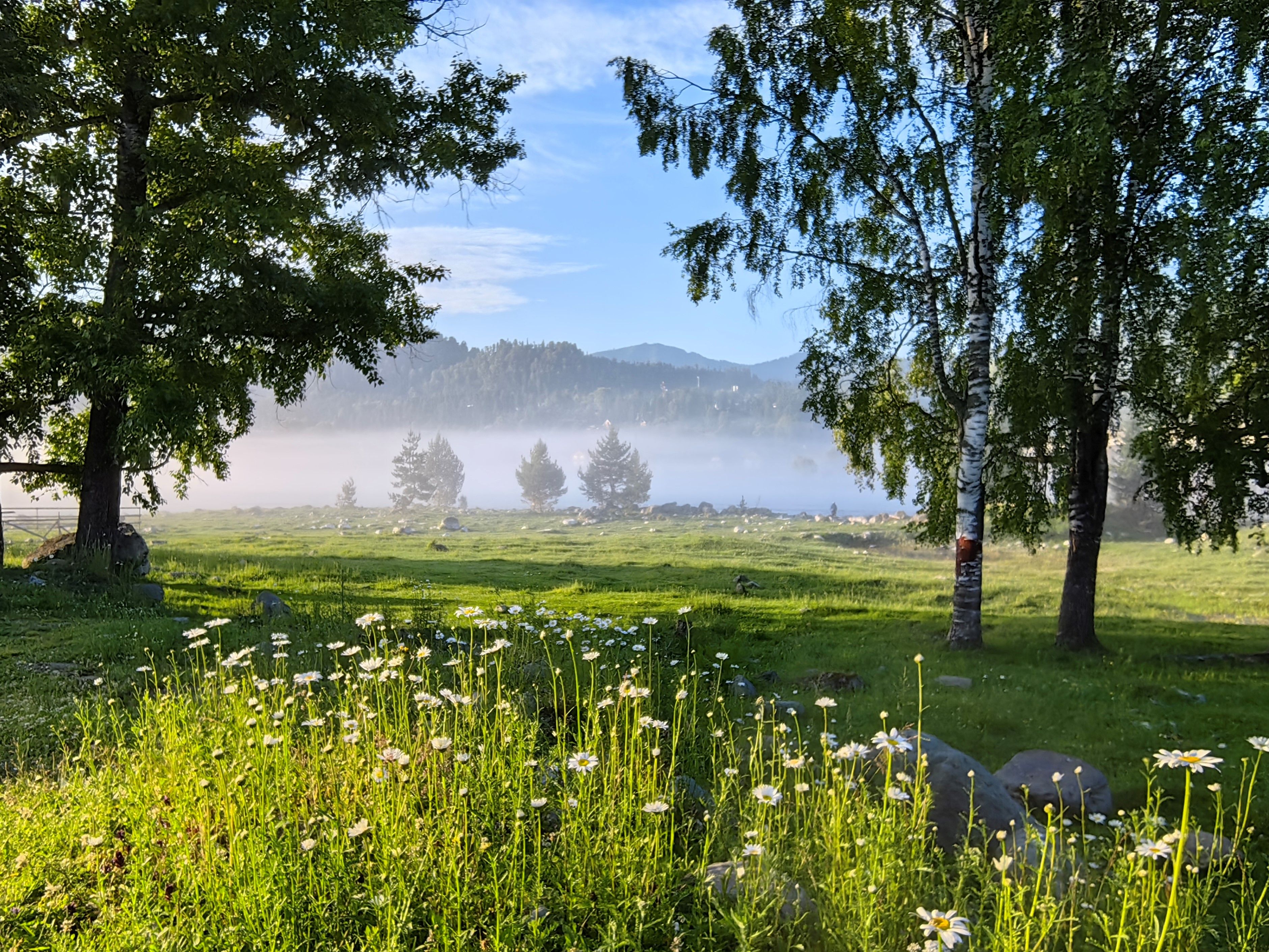 пейзаж,алтай.лето,ромашки,деревья,туман,горы, Козлова Галина