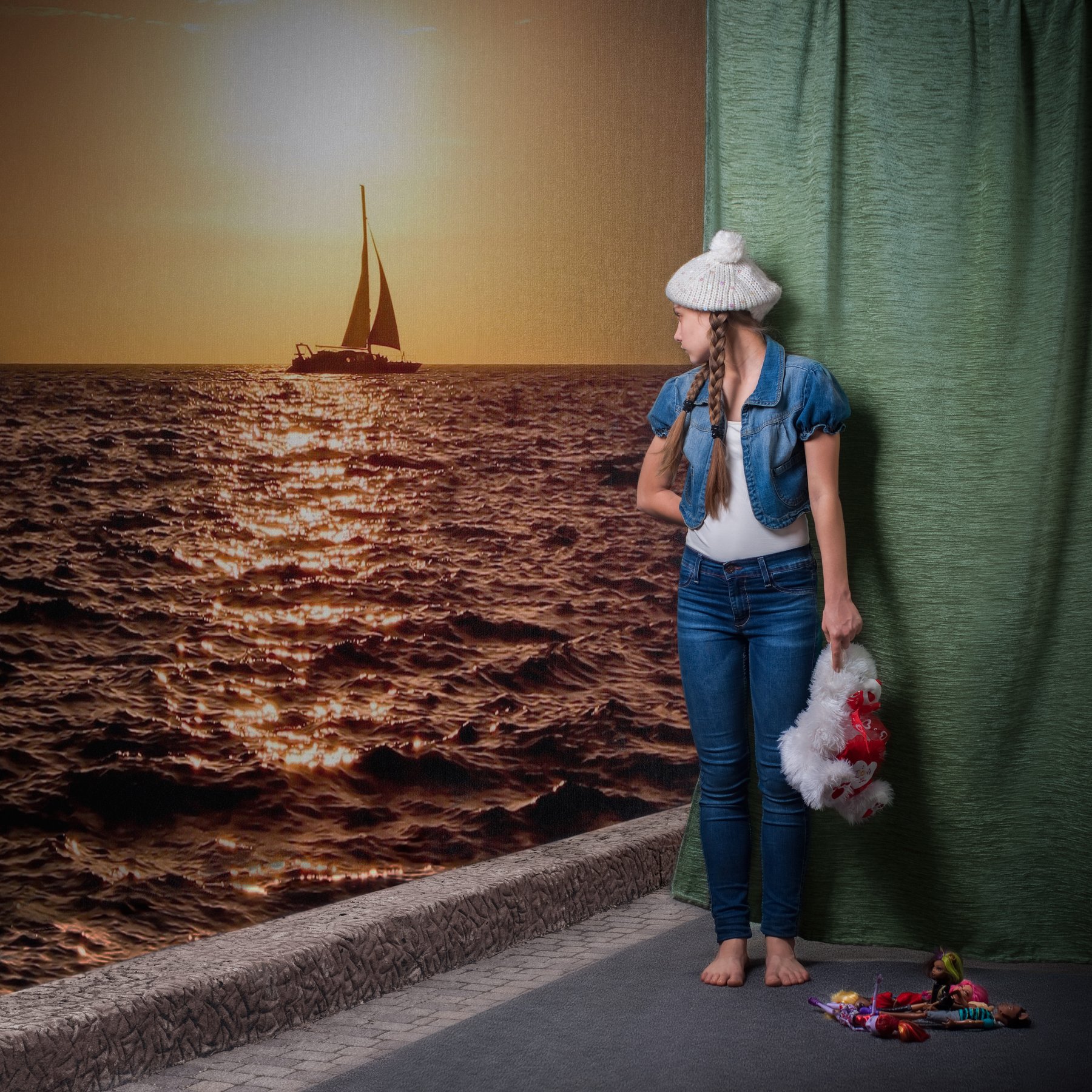 Фото посвящено 14-летию дочери. Этот возраст-некий рубеж между детством и взрослой самостоятельной жизнью. Занавес олицетворяет этот рубеж, безбрежный океан-взрослую жизнь, ждущую её впереди, где она будет самостоятельно курсировать, как тот парусник. Она уже частично готова, а частично ещё в своём детстве...