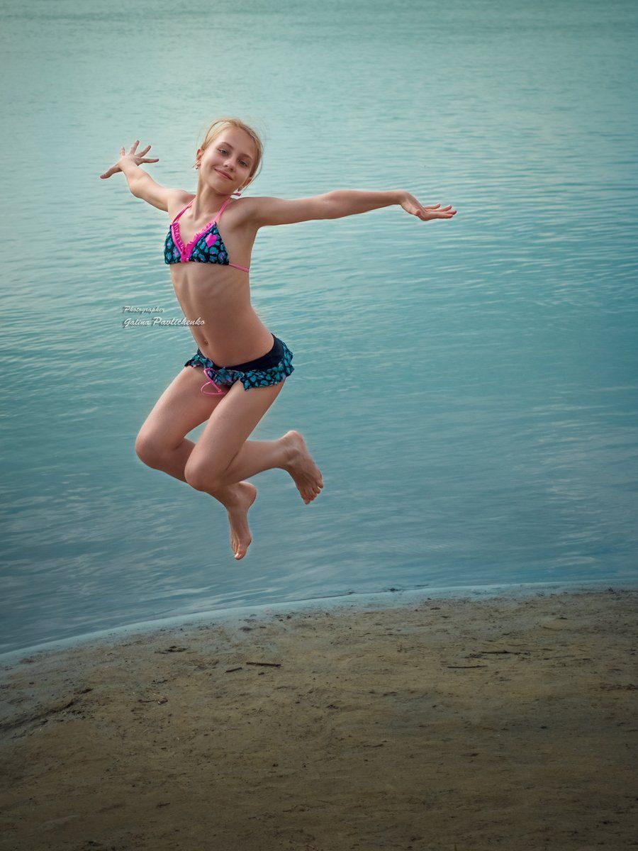движение, девочка, каникулы, летать, лето, отдых, пляж, прыжок, река, Галя