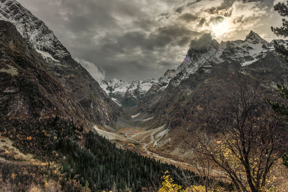 Красиво! Только такой зоны у нас нет:(... За тучкой спряталась вершина Бу-Ульген (\"Мертвый олень\"). Справа острый пик - пик Лена Мухамедова. Он находится рядом с вершиной Доттах-Къая, откуда на спуске сорвалась и погибла Лена Мухамедова. Она на альпинистском кладбище в Алибеке лежит... Такая вот грустная история ....