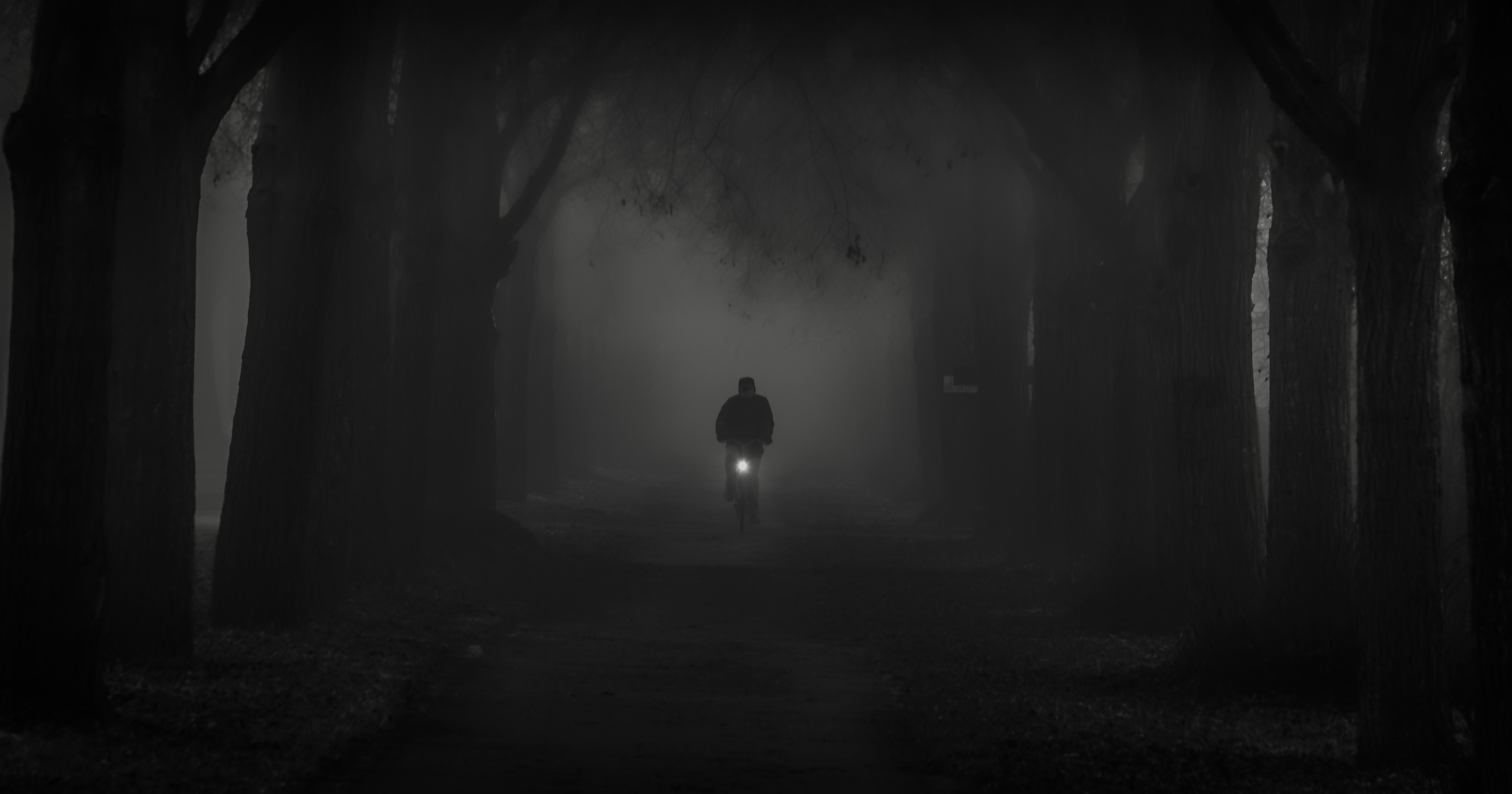 Noc, Mgła, Drzewa, Rowerzysta, Strach, Czas, Droga, Jesień, Krzysztof Tollas