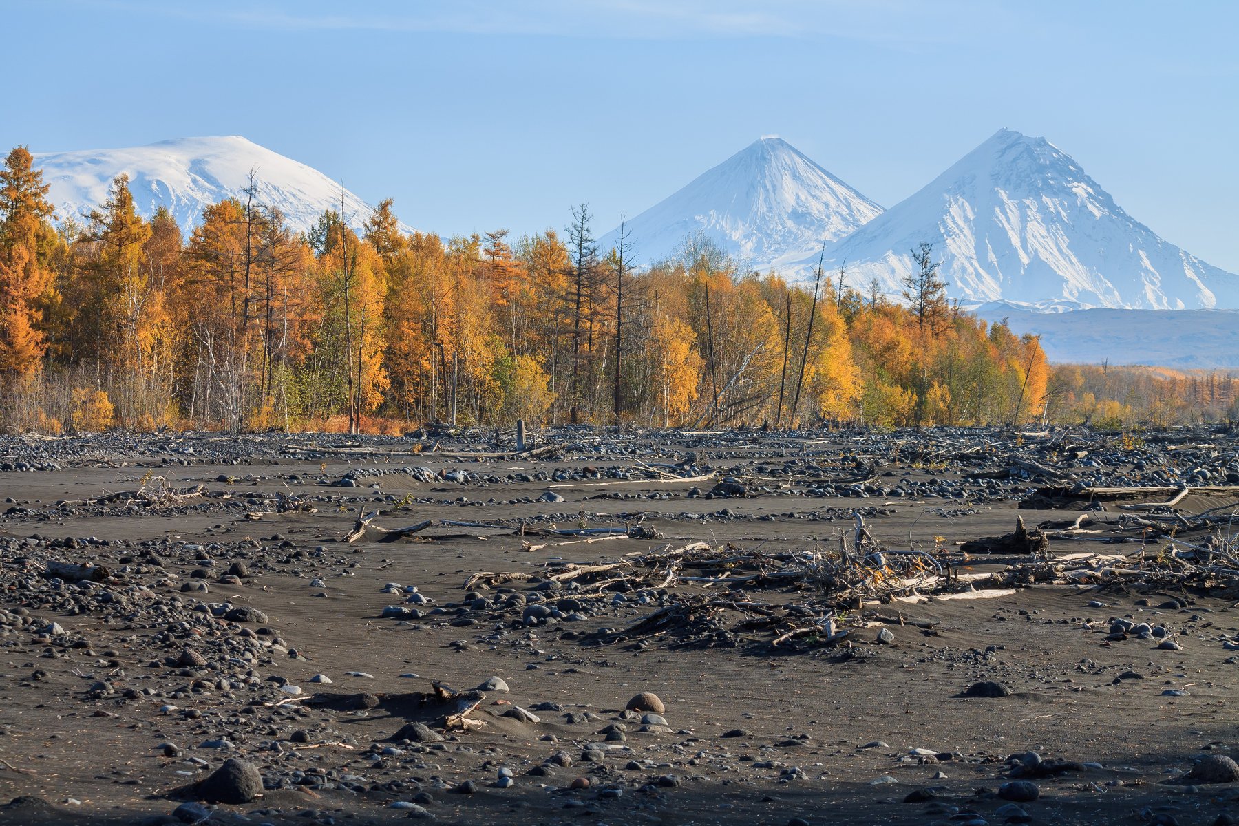 Дух захватывает. До вулканов около 20 км. Меньше года назад на момент съемки этого фото извергался плоский Толбачик. Мы почти достигли его лавового потока. Который все еще остывает, а высота лавового потока выше крон деревьев.