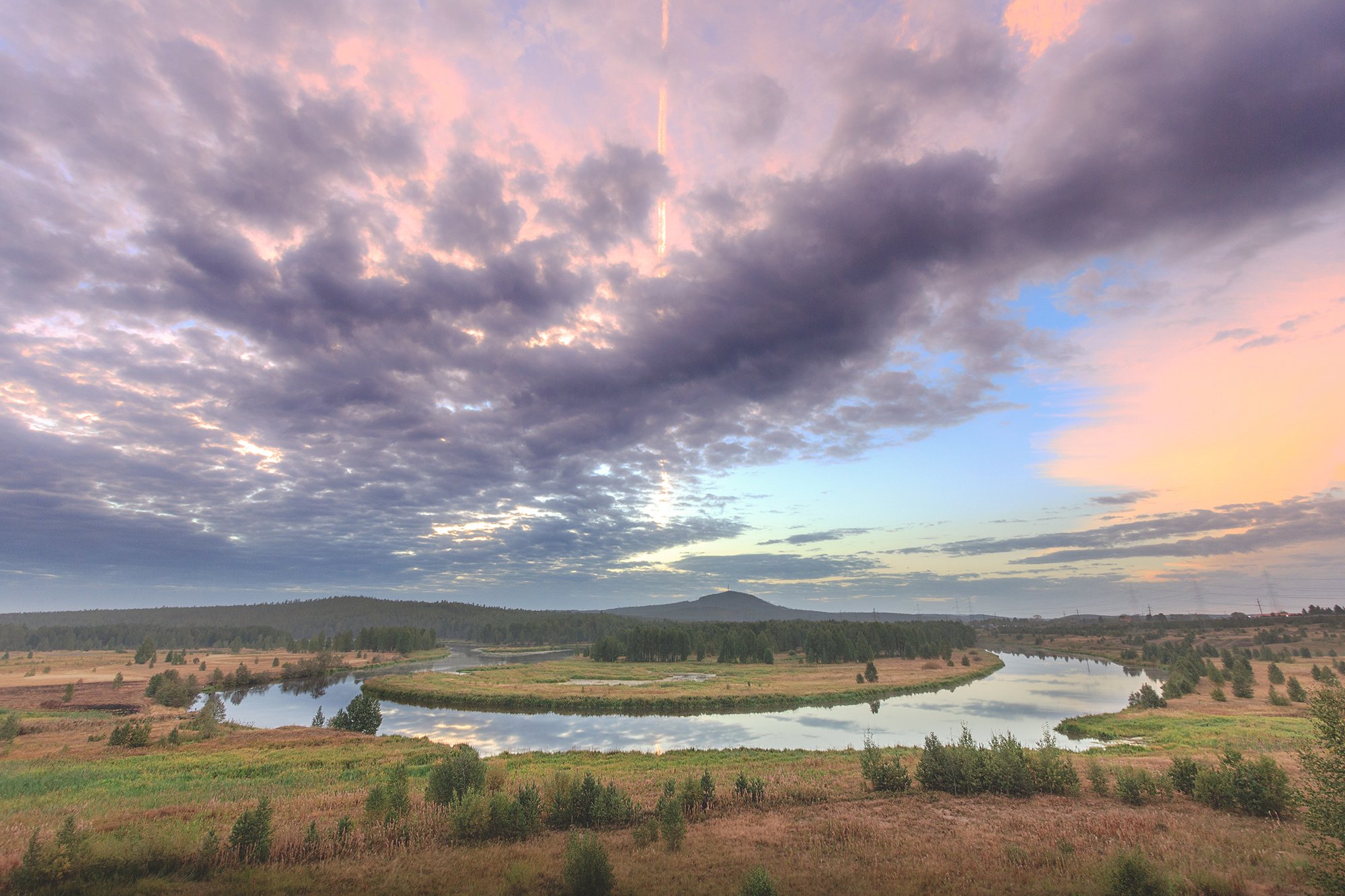 Изгиб реки Чусовая. На заднем плане гора Волчиха (526 м), получившая названия то ли от обильного количества волков в этих местах в прежние времена, то ли о того, что лодки и лес волочили из Чусовой (бассейн Волги) в реку Исеть (бассейн Оби).
