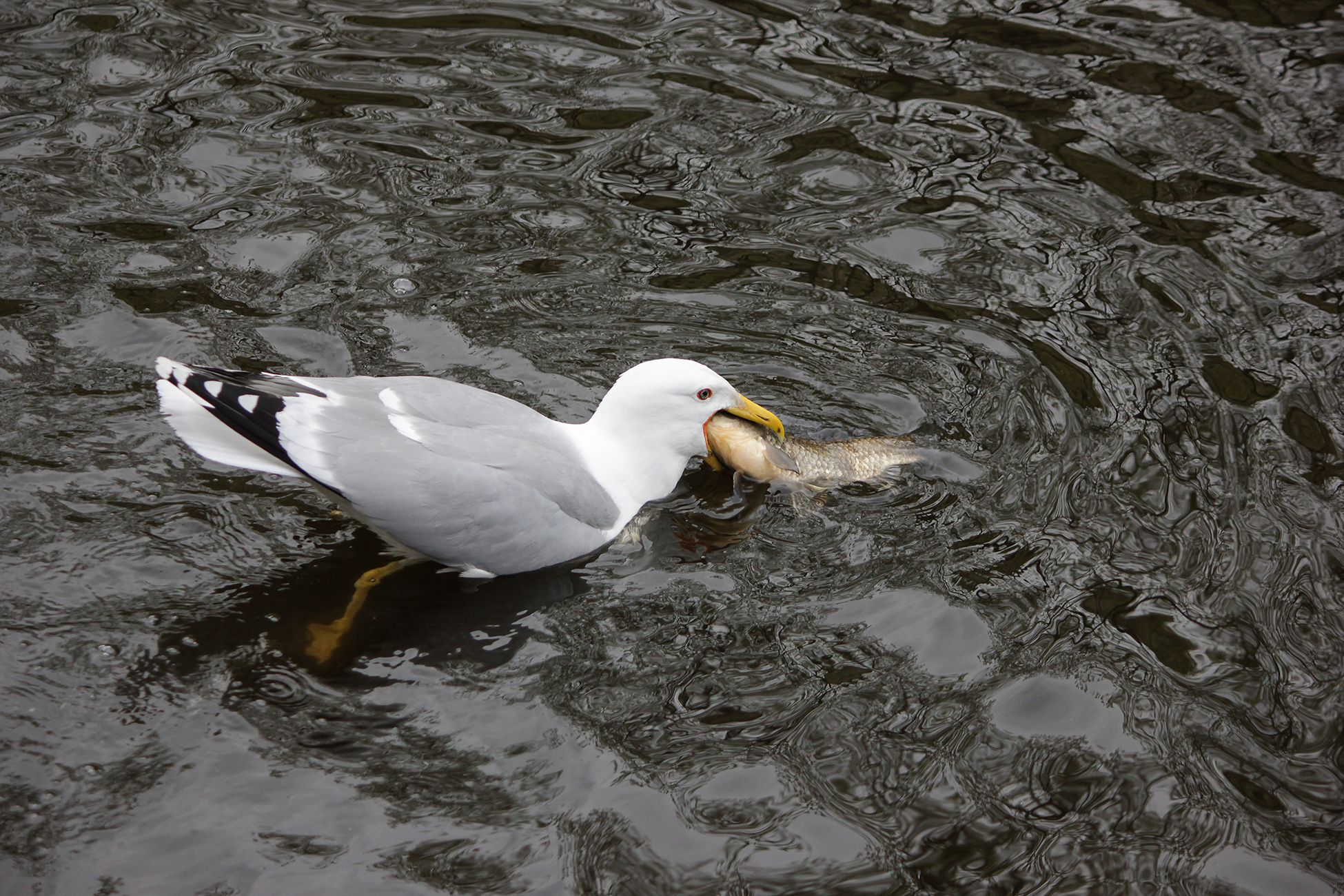 Серебристая чайка (Larus argentatus) поймала крупного карпа, но проглотить добычу, как ни старалась, не смогла. Рыба активно сопротивлялась, и, улучшив момент благополучно уплыла в глубину...