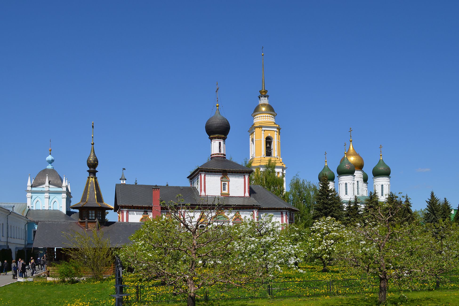 Подмосковная Коломна. Сад Свято-Троицкого Ново-Голутвина женского монастыря с видом на соборы коломенского Кремля. На переднем плане с черным куполом - Троицкая церковь(1705 г) Ново-Голутвина монастыря..