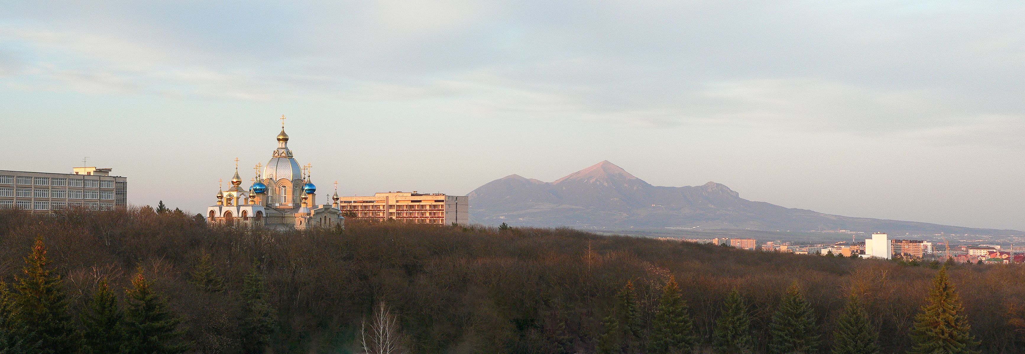 Ессентуки. На переднем плане Курортный парк и Церковь Святого Пантелеимона, на заднем плане видна Бештау- самая высокая гора Кавказских Минеральных Вод.