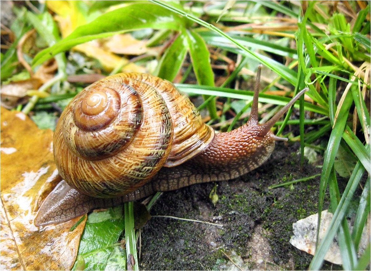 Виноградная улитка (лат. Helix pomatia). Крупнейшая улитка Европы. В природе виноградная улитка живёт в среднем 7—8 лет. Зарегистрированный рекорд равен 30 годам. Вырастает до 10 сантиметров в длину. Зимует в норках, которые сама и выкапывает...