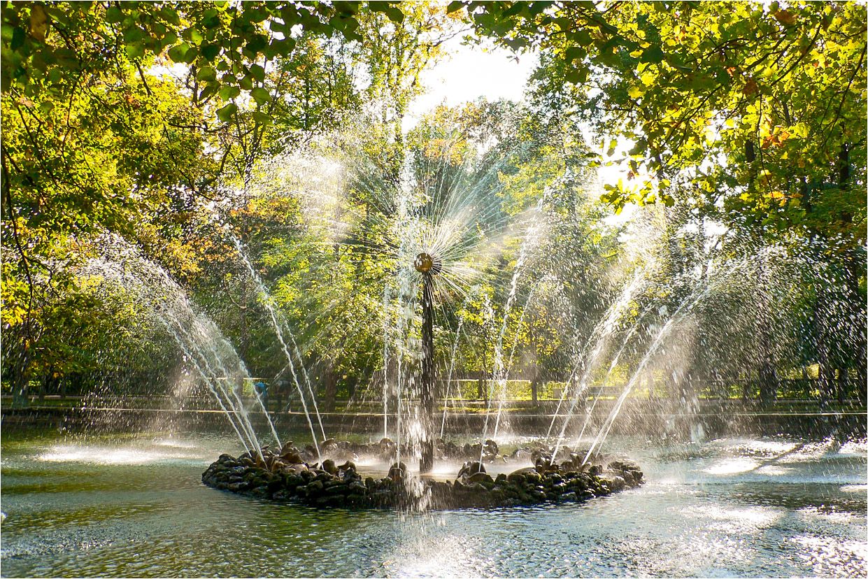 Фонтан "Солнце" расположен на юге Нижнего парка Петергофа. Он был построен в 1724 году для Петра I. При императрице Екатерине II фонтан был переделан и получил название "Солнце". В постаменте, украшенном шестнадцатью позолоченными дельфинами, скрыт механизм с водяным колесом. Под действием воды колесо вращается, и при помощи зубчатой передачи вращение передается на колонну с тремя золочеными дисками, которые имеют 187 отверстий для выхода воды. Струи воды бьют одновременно по краям дисков и из раскрытых пастей дельфинов, разлетаясь во все стороны и в солнечную погоду переливаются многоцветной радугой.