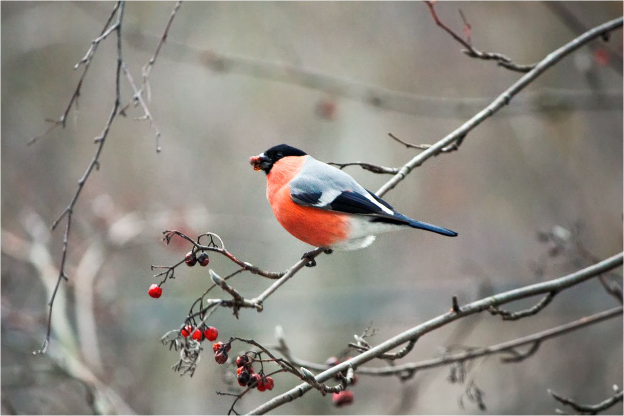 Снегирь, или обыкновенный снегирь (лат. Pyrrhula pyrrhula) — певчая птица рода снегирей (Pyrrhula), семейства вьюрковых. Самец. У самочки грудка серо-бурого цвета.