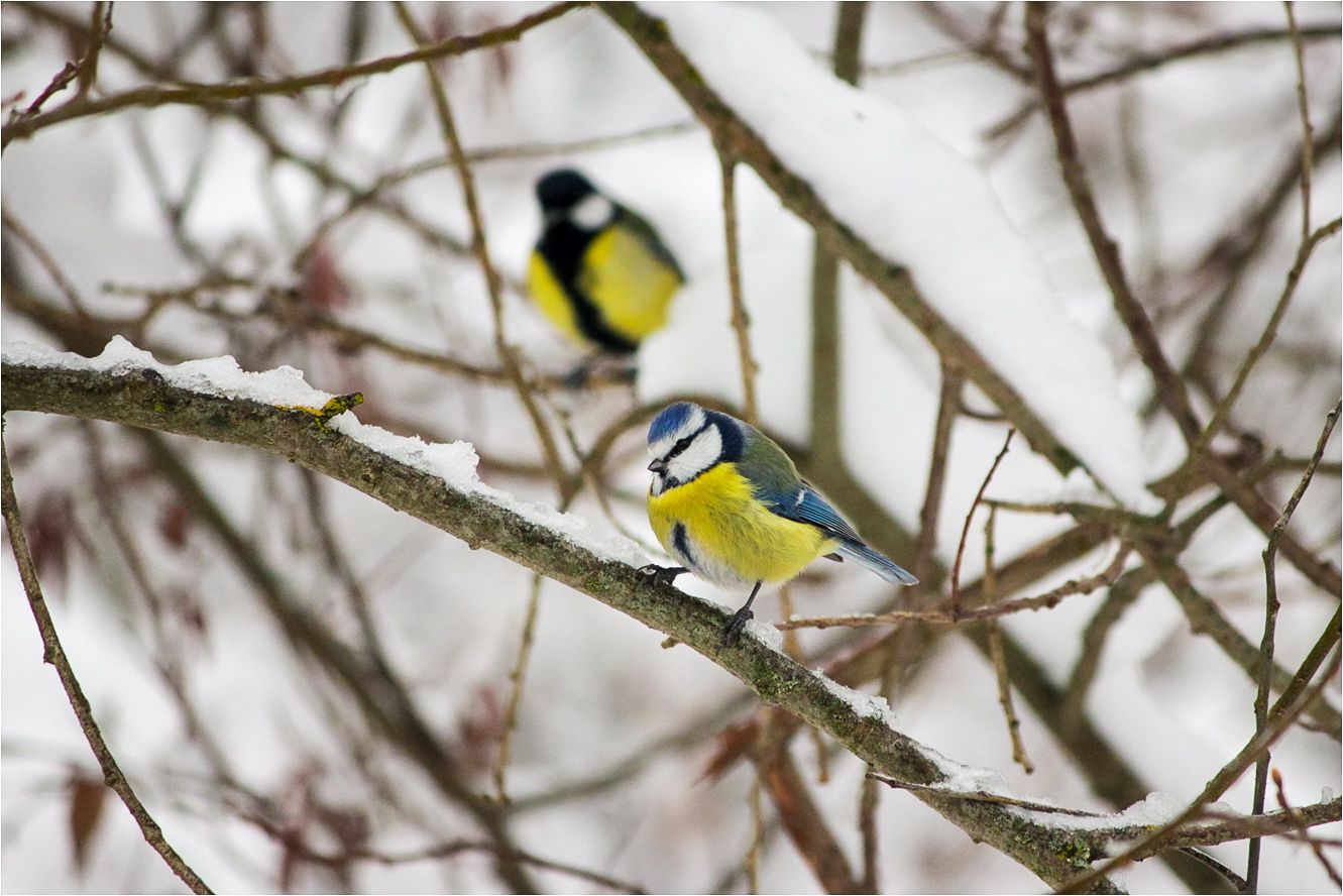 На заднем плане большая синица, или большак (лат. Parus major)...