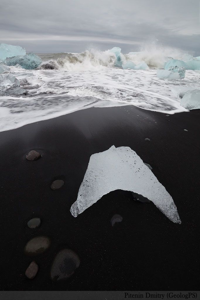 Снято при поездке в Исландию. Небольшой шторм на вулканическом пляже играет льдинами.выбрасывая на черный песок светящиеся белые обломки. Но они потом снова возвращаются в море.