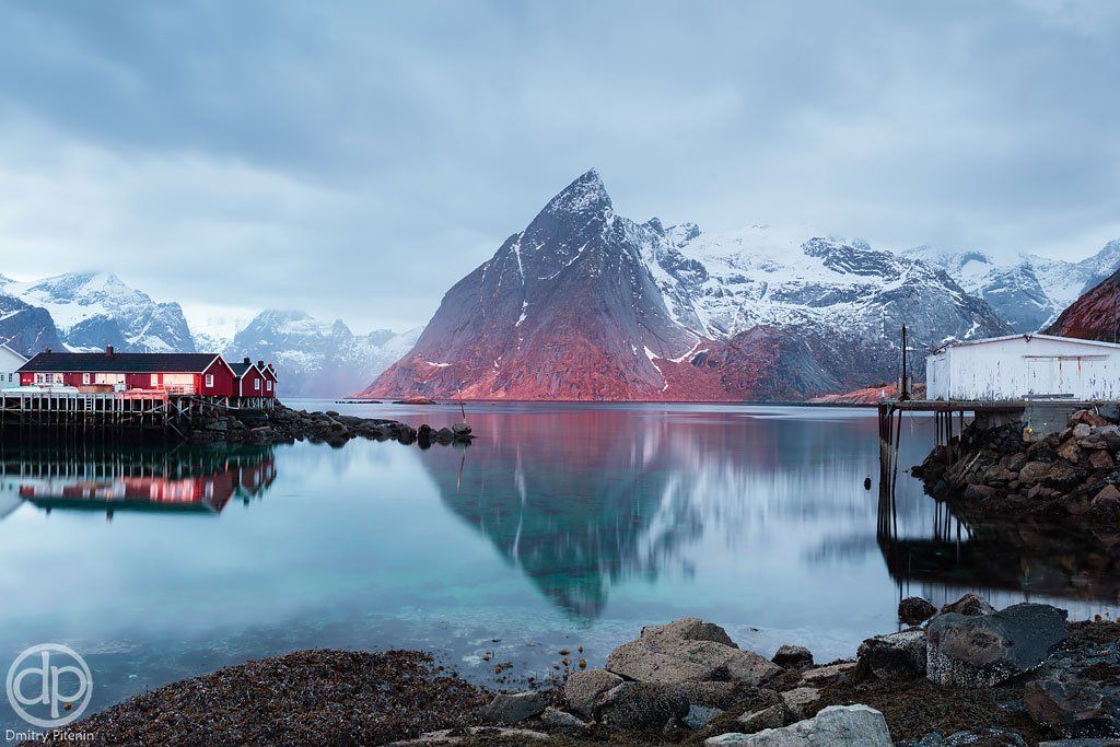 Хамной. Приехали сюда до рассвета, поснимали в синих сумерках сюжет с рорбу с горящим светом в редких окнах. Восхода ничего не предвещало. Собрали вещи и поехали искать новое место. Отъехав и выйдя из машины увидели зажегшуюся макушку горы. Быстрый поиск сюжета результатов не дал, кинулись в машину и приехали назад. Солнце светило сквозь узкую щелку облаков, на горящую макушку мы опоздали, успели снять освещенное основание. Но так даже интереснее получилось, редкий случай такого локального освещения. Через минуту солнце скрылось за тучами - на весь день.