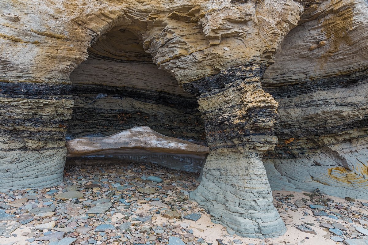 Из года в год морской прибой разбивается о песчаниковые скалы, вытачивая в слоистых трещиноватых пластах большие ниши и стройные колонны. Лишь ниже верхней границы приливной волны песчаники голубоватые и гладкие, выше же, куда добивают только брызги, скалы покрыты следами сульфидных оксидов, которыми изобилуют прослойки каменных углей.