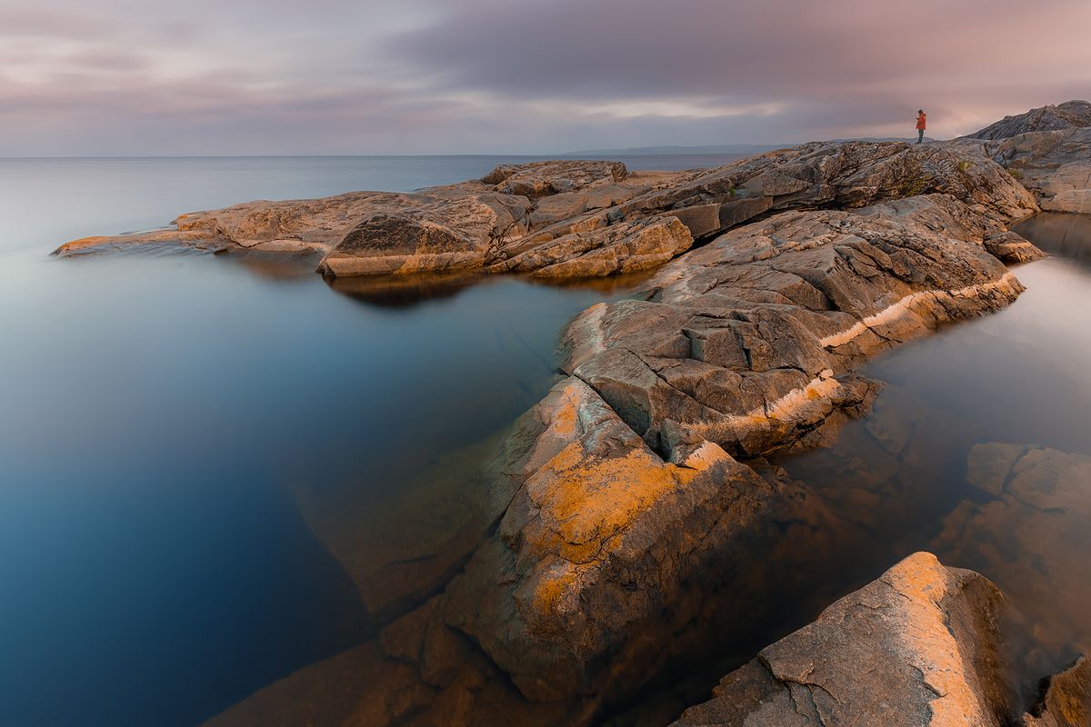 Когда солнце уходит за горизонт, а Ладога стихает, можно выйти на голые скалы и долго любоваться бесконечными водами, которые смыкаются с небом.