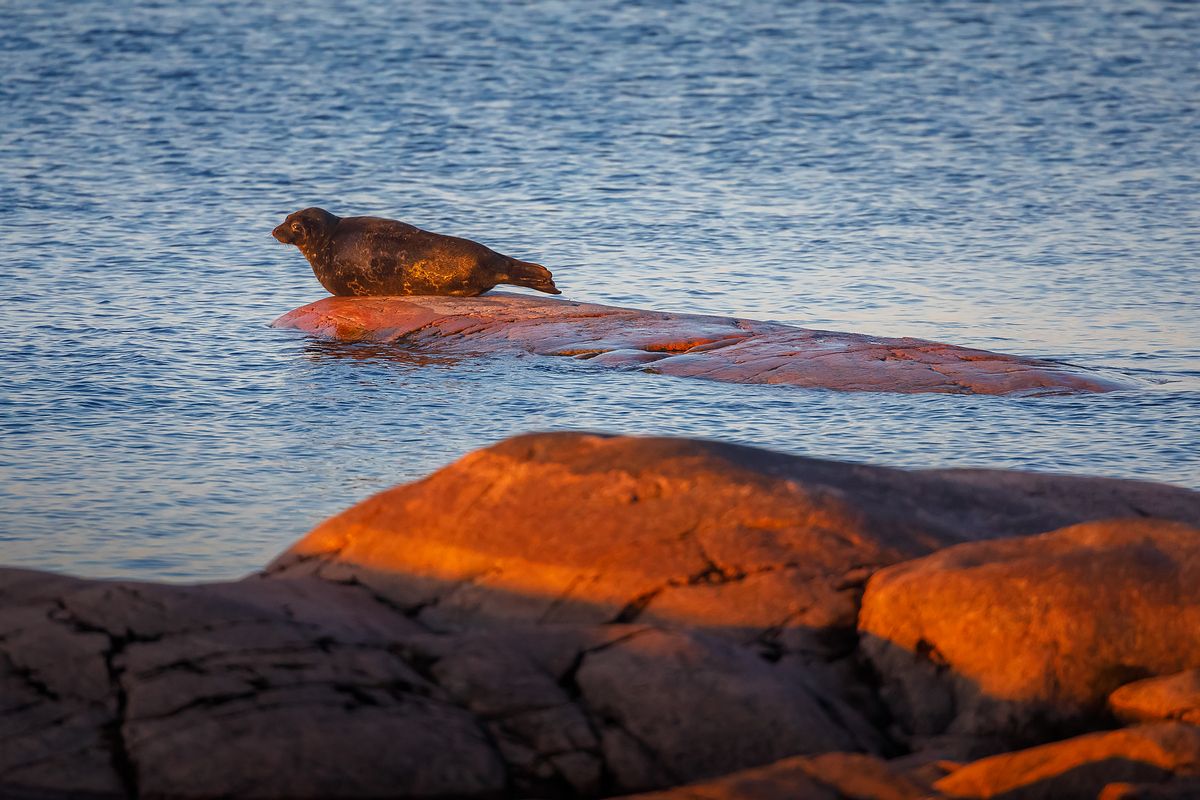 Когда Ладога еще ледяная, а воздух уже давно прогрелся, на слегка выступающие из воды луды любит выходить нерпа. После долгой зимы всем тюленям приятно понежиться в солнечных лучах, а особо нетерпеливые уже лежат на камнях в первые минуты рассвета.