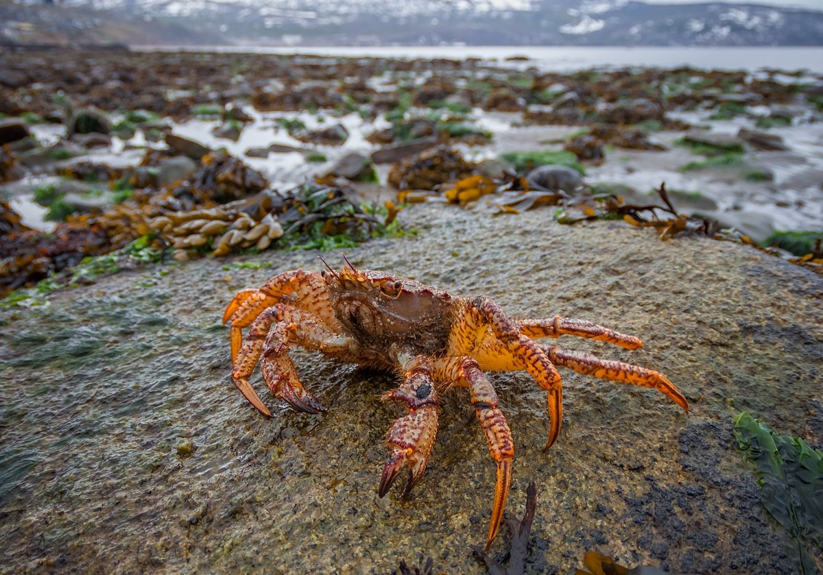 Этого волосатого краба я заметил в последний момент, когда снимал бухту Нагаева во время отлива. Из песка торчали лишь усики и глазики на ножках, которые длительное время наблюдали за мной. Но снимать лишь один крабий взгляд меня не радовало, и на его несчастье я вынудил таки вылезти крабика на камушек и показать себя целиком. Сидеть на открытом месте ему оказалось не комфортно, и он лишь пробежал бочком в сторону клубка морской капусты, но и этих секунд мне оказалось достаточно, чтобы сделать крабий портрет.