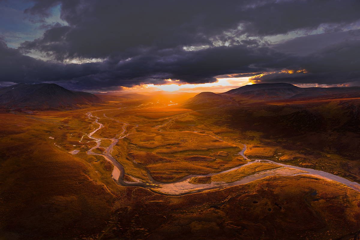 Мы возвращались с тундровых озер на восточной стороне Полярного Урала в пасмурный и дождливый день. Небо было затянуто низкими темными тучами, в которых прятались верхушки гор. Никакой надежды на закат не было вообще. Добравшись на вездеходе до стойбища оленеводов и разбирая вещи в уже темнеющих сумерках, внезапно кто-то включил прожектор на горизонте! Узкий, но невероятно мощный луч света шибанул по тундре под нашими ногами так, что все в шоке уставились на его источник. И только через несколько секунд фотографы побросали все свои вещи на землю, схватили фотоаппараты и ринулись на ближайшую сопку! Но я присмотрел на горизонте реку в километре от нас. Добежать до нее шансов не было, свет включили буквально на пару минут. Закрапали остатки дождика, но я все же рискнул поднять дрон в небо. И не прогадал.