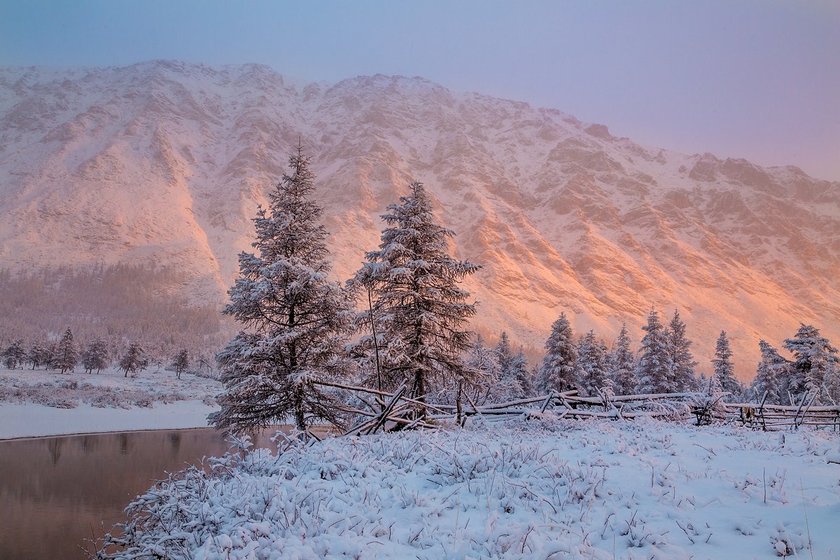 В горной лесотундре в начале сентября часто бывают заморозки, иногда выпадает снег. Но 10 сентября белых хлопьев насыпало выше колена, а впереди был долгий маршрут и 130 километров по болотам и перевалам. Стало немного не по себе от того, как нас провожал хребет Черского, но потрясающий рассвет сгладил беспокойство перед походом. Якутия, водораздел Яны и Индигирки, 2013.