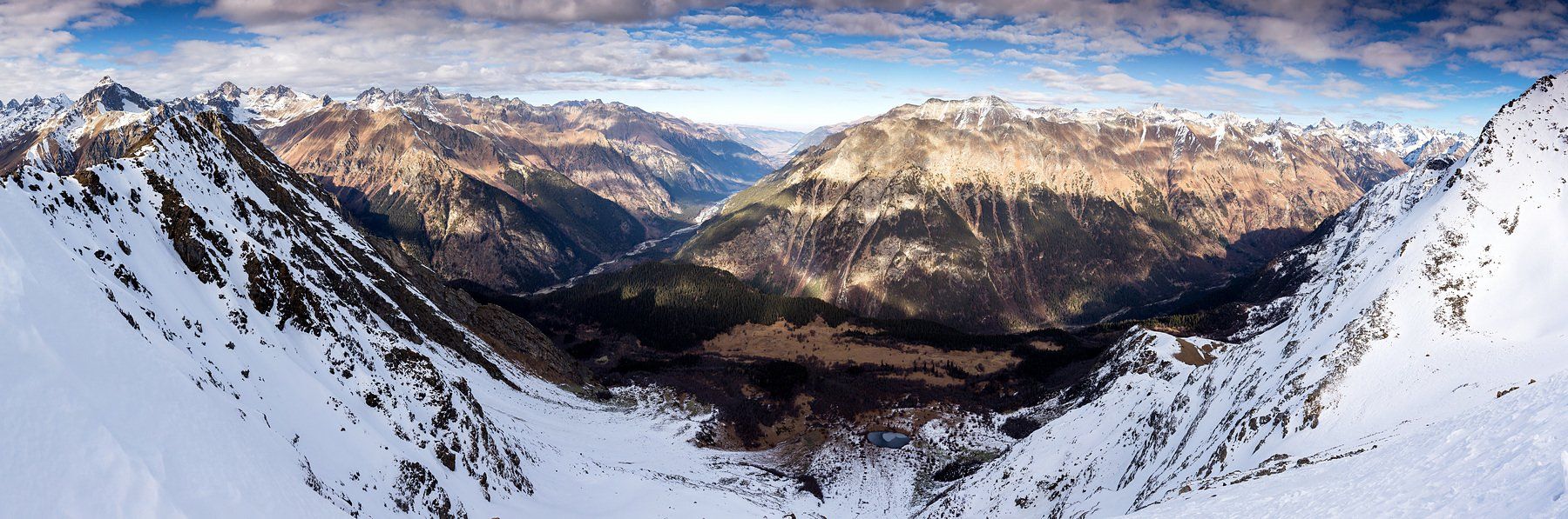 Пока все шарахались по прокатным конторам и прочим кафешкам, я по колено в снегу наблюдал озаренную солнцем долину Теберды и окрестности Домбая. Редкий турист, проползающий мимо, с недоумением обращал свой взор на штатив вместо сноуборда в моих руках. Черкессия, ноябрь 2013.