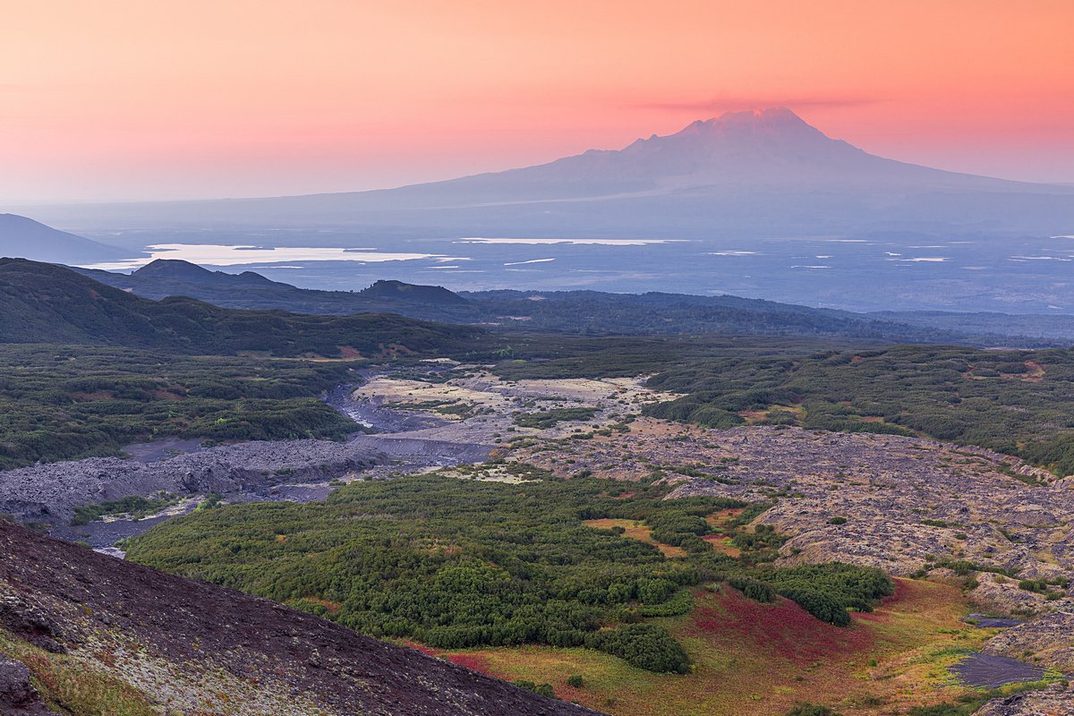 Изрезанная лавовыми потоками разного возраста, земля местами оделась в ольховый кустарник, а где то покрылась лишь травой и ягодой. Несмотря на весьма суровую жизнь на склоне вулкана, природа старается залечить растительностью оставленные извержениями шрамы. Окрестности Ключевского вулкана, Камчатка.