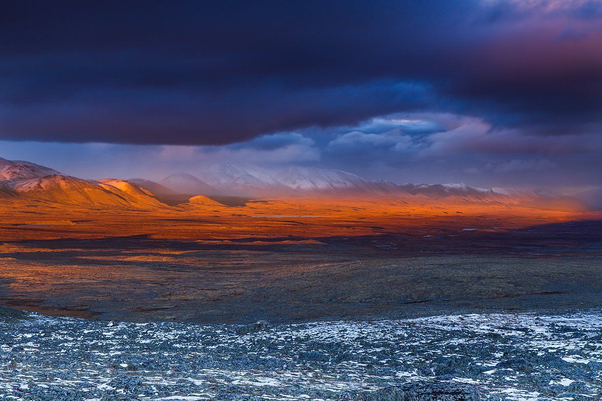 Темные тяжелые тучи кружили над головой, долго не решаясь, чего им хочется больше - прорваться снова и вылить из себя еще порцию мокрого снега, или все таки пустить сочную порцию солнечного света на промокшую тундру. Но, вероятно, снег в тучах кончился, и яркий луч выстрелил сквозь рваное небо, высветив озера вдалеке и заснеженные горы.