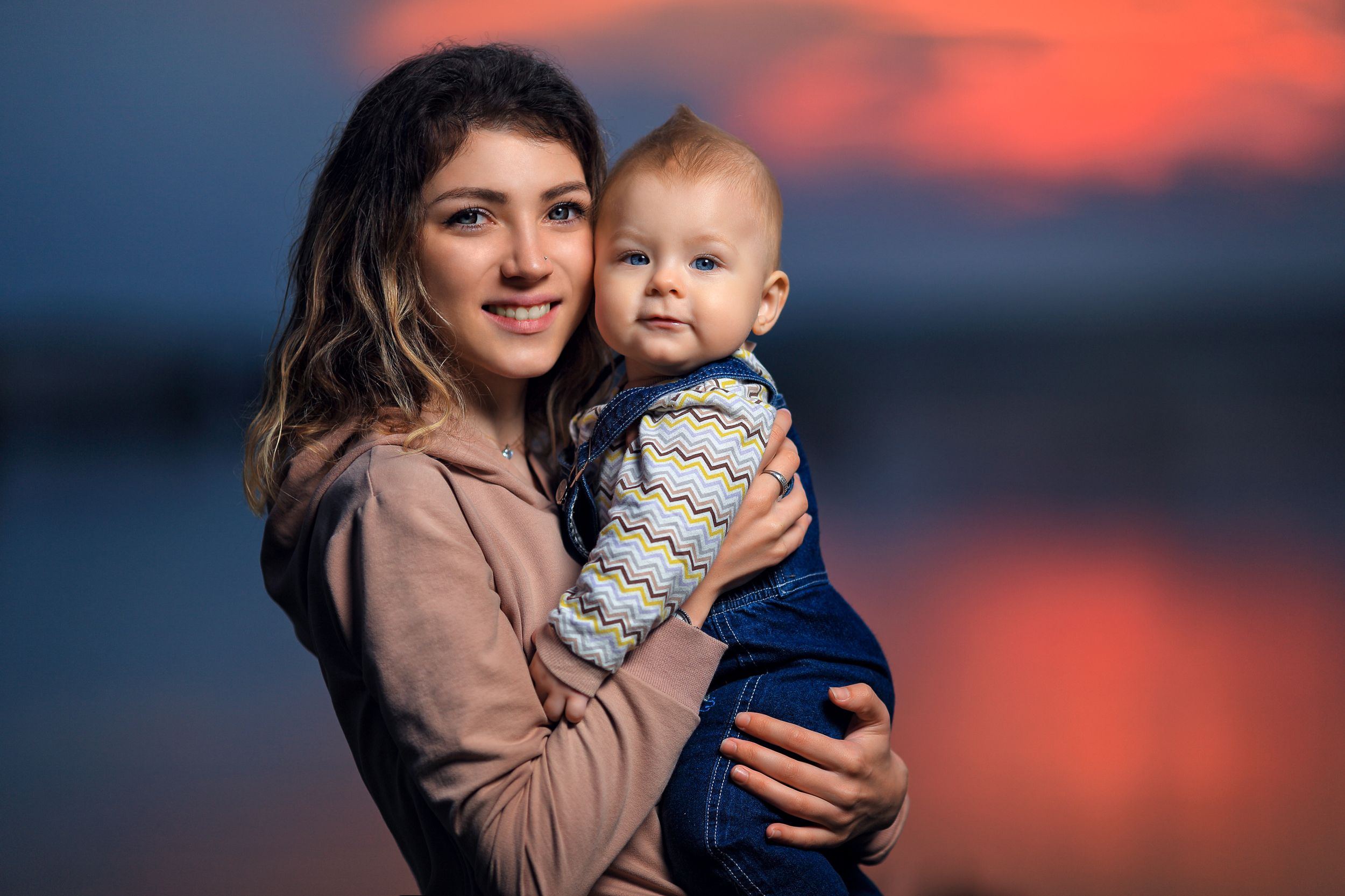 девушкаребёнокмладенецдевушка с младенцемсинийрозовыйзакатприроданебофотосессия