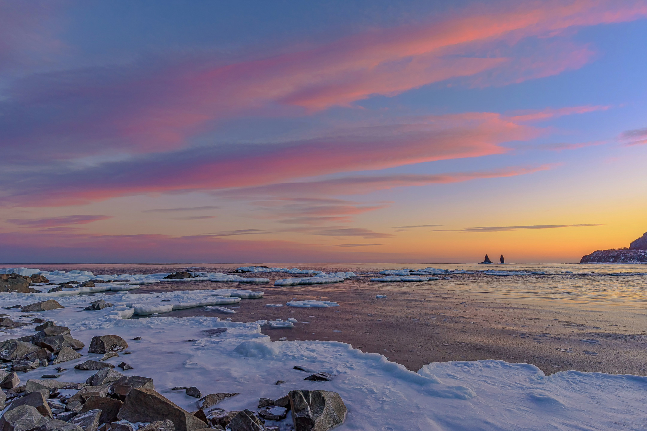 Продолжение с давней январской прогулки под маяком. Виды из-под скальной стены мыса Бринера. Кекуры Два Брата.
