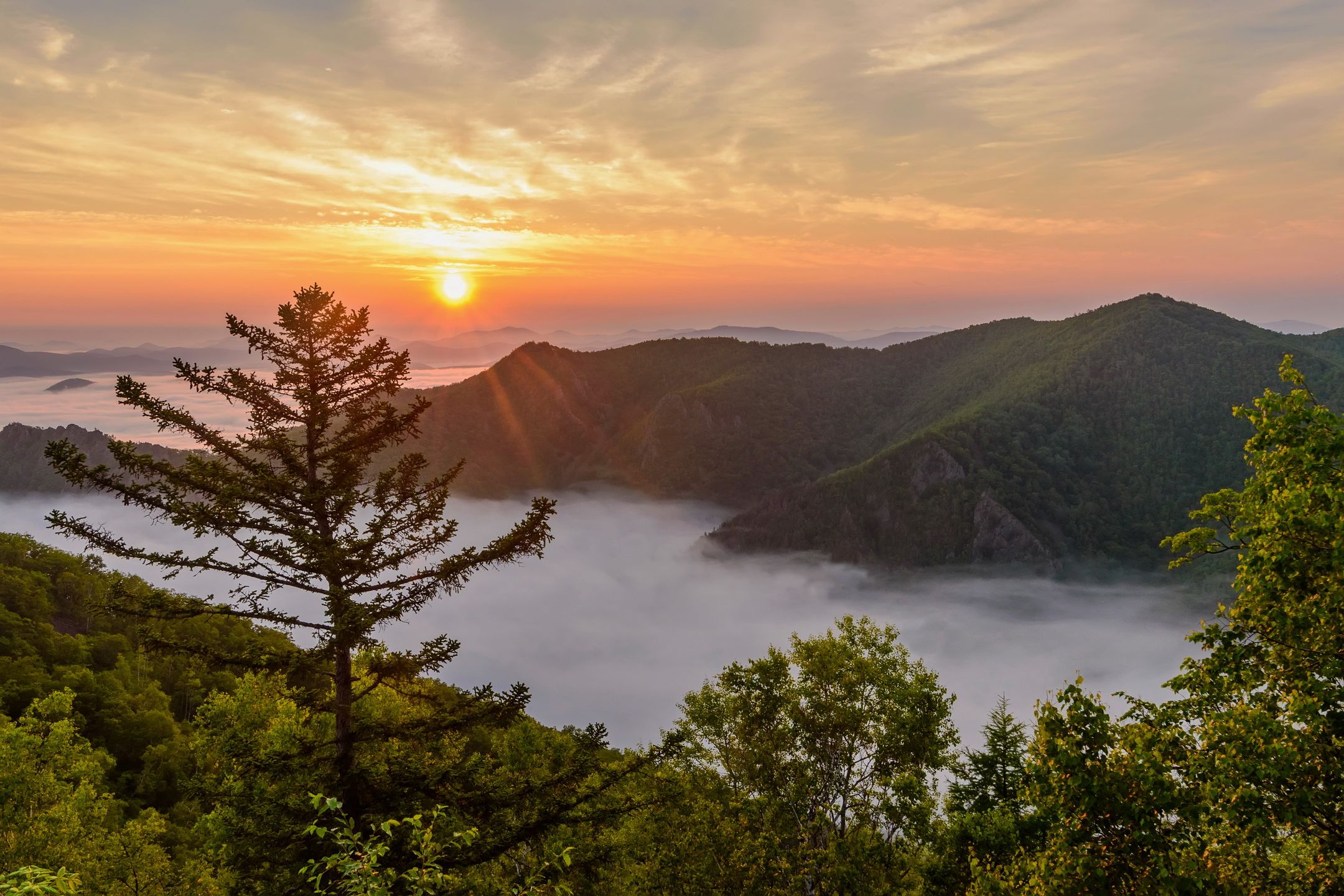 Красивый восход в горах, а под туманом город, в котором хмурое туманное утро... Долину накрыл наползший с моря, еще вечером, туман. Июль 2019.
