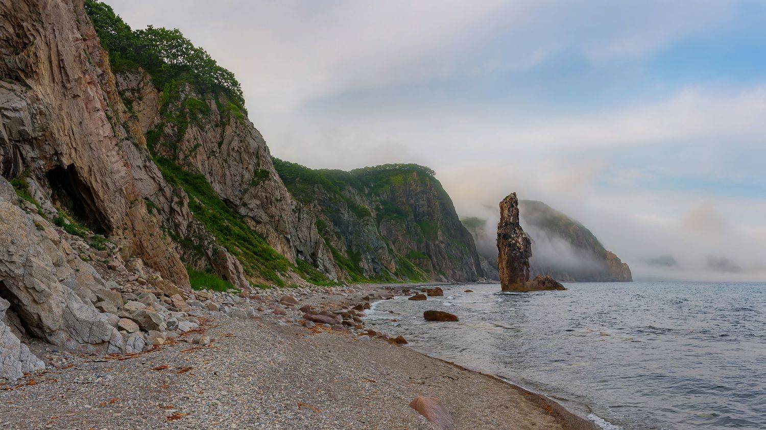 Одиночный кекур (название, похоже, народное) южней входа в залив Владимира и мыса Четырех скал. Мыс виден на ЗП первых четырех снимков. Июль, август 2023