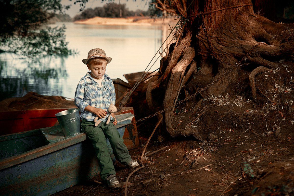 лодка, ребенок, мальчик, река, дерево, лето, Георгий Муравьёв