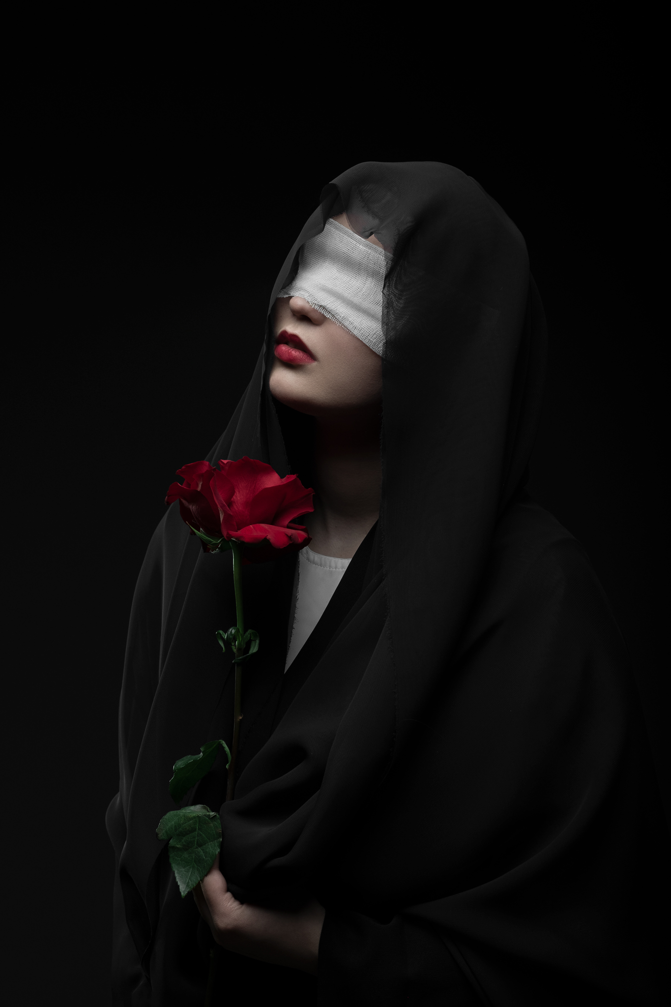 Ткань — как фон, как обёртка, как часть образа. Поза — следствие. Роза — точка, где всё сходится. Чёрное и красное, тьма и свет — всё вроде как по плану. Готика, но не просто стиль — это настроение, что не выходит из кадра. 🖤🌹