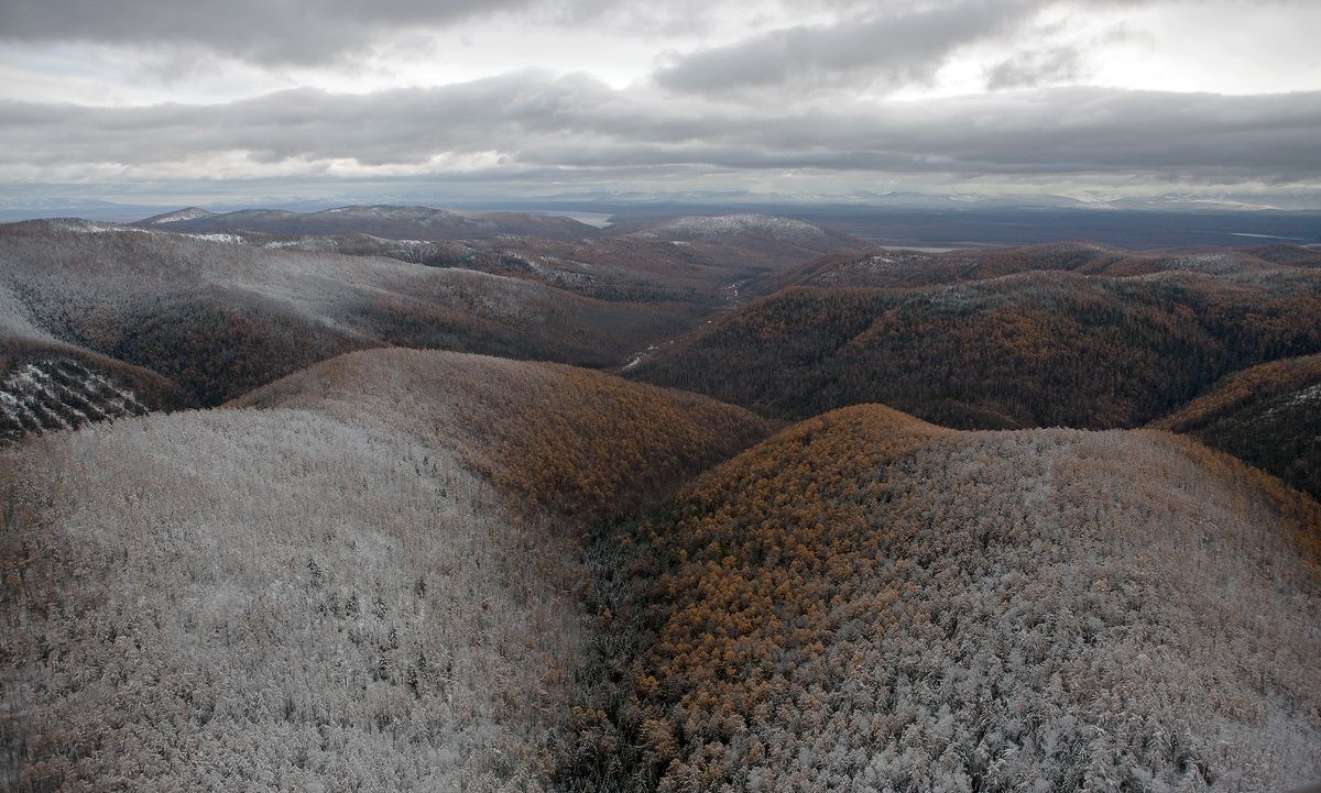 По осени летали мы сплавом тайменя ловить. Было это на севере Хабаровского края, примерно на широте Охотска. Забрасывал нас МИ-8, пока летели - пощелкал через иллюминатор.