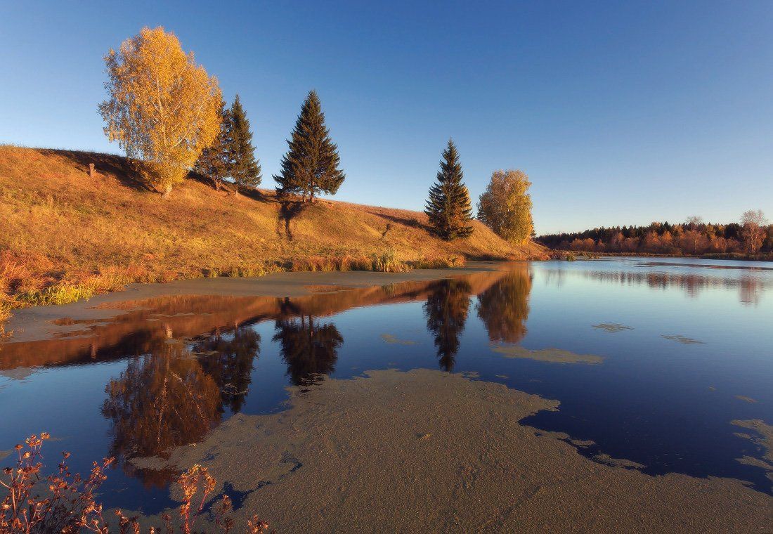 озеро, вода, отражения, , елки, березы, лес, деревья, трава, лес, вечер, осень, Георгий Машковцев