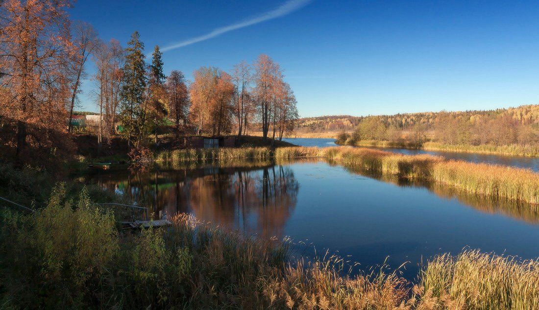 речка, трава, заводь, мостик, деревья, лес, отражения, вечер, осень, Георгий Машковцев