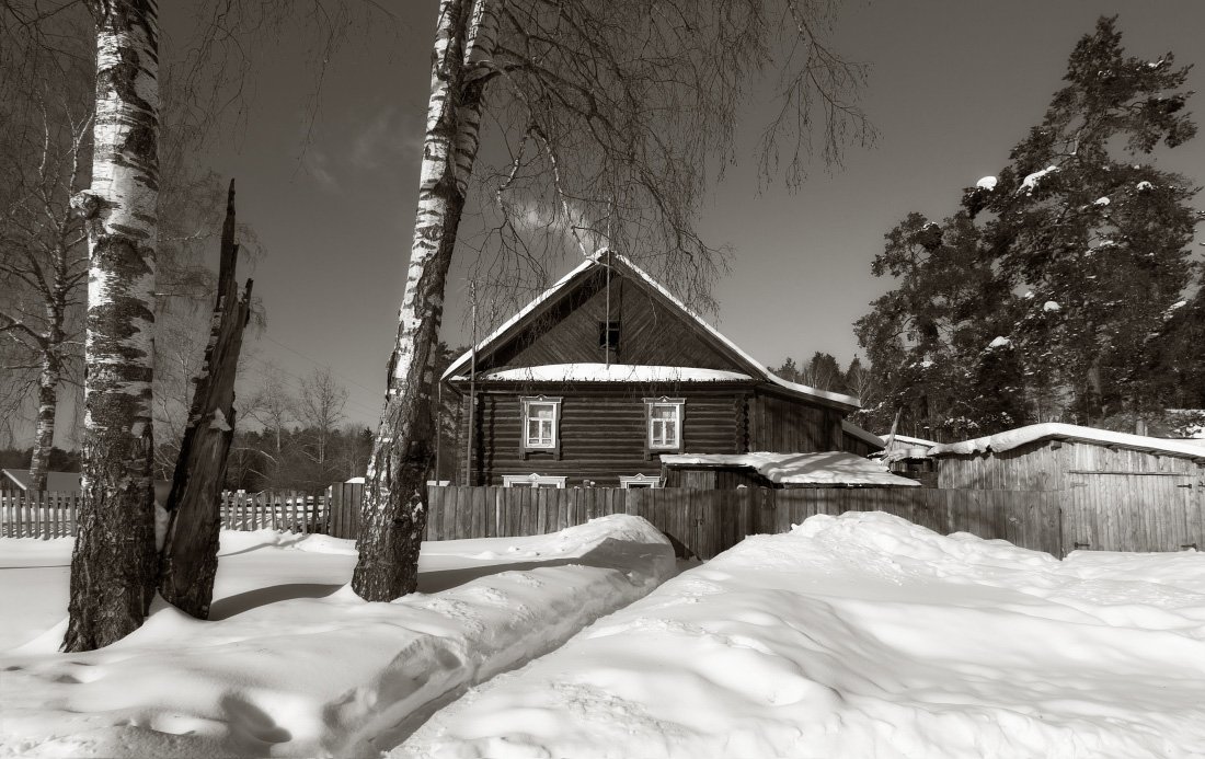 снег, тропинка, сугробы, дом, избушка, дым, березы, лес, зима, мороз, Георгий Машковцев