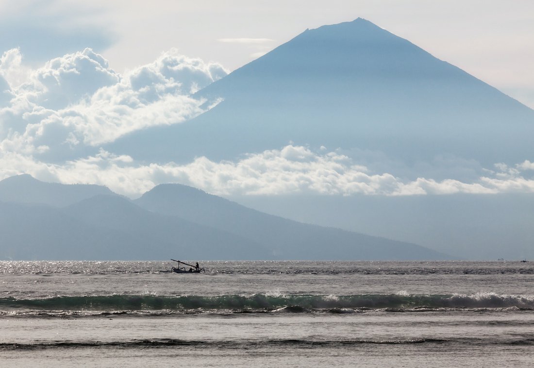 море, волны, лодка, горы, вулкан, облака, индонезия, Георгий Машковцев