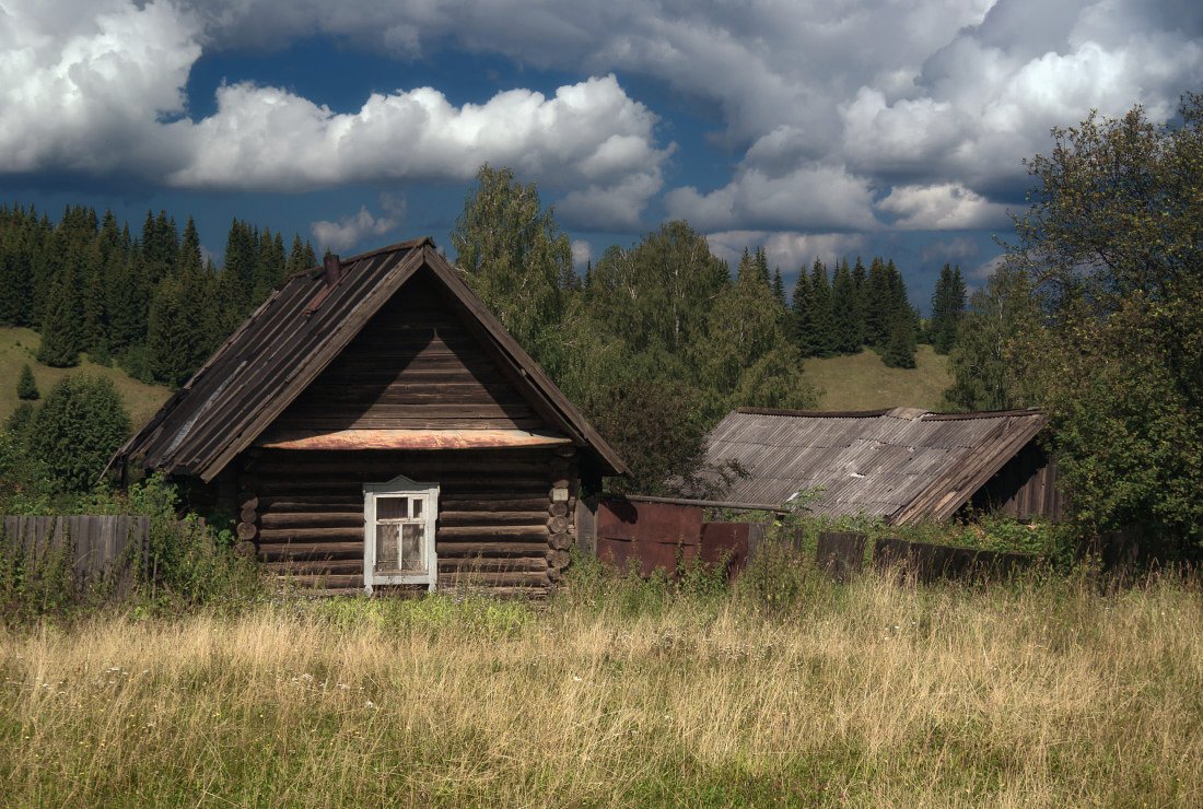 трава, избушка, забор, лес, облака, лето, Георгий Машковцев