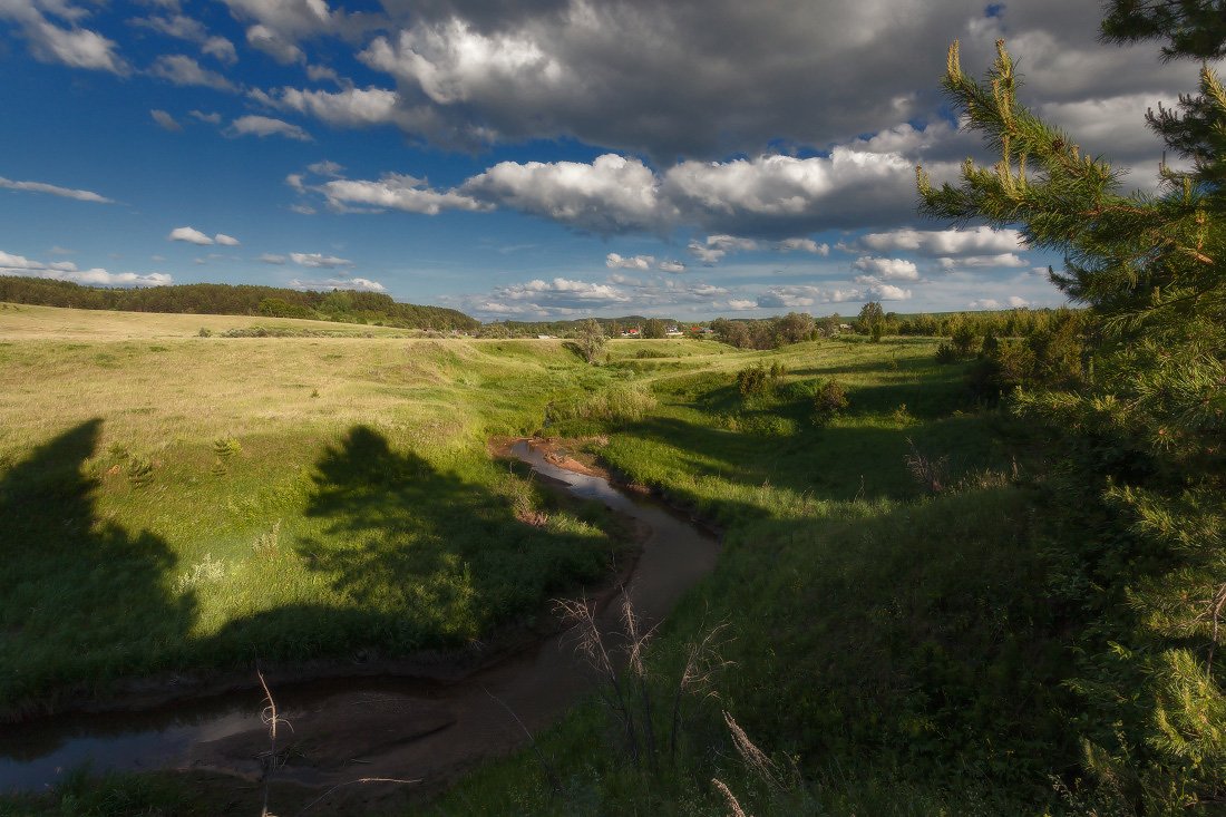 речка, русло, склоны, трава, лес, тени, облака, лето, Георгий Машковцев