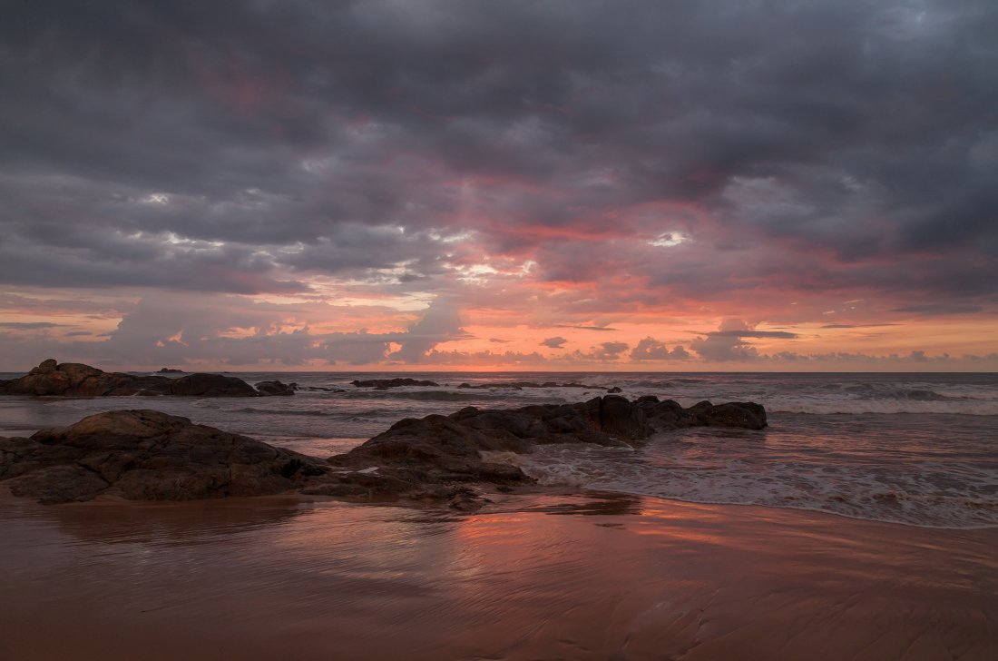песок, океан, камни, отражения, облака, закат, шри ланка, Георгий Машковцев