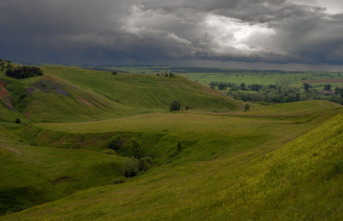 склоны, трава, цветы, зелень, деревья, лес, тучи, лето, Георгий Машковцев
