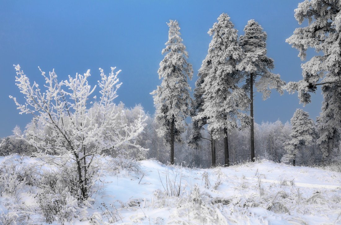 снег, иней, деревья, лес, небо, синее, зима, Георгий Машковцев