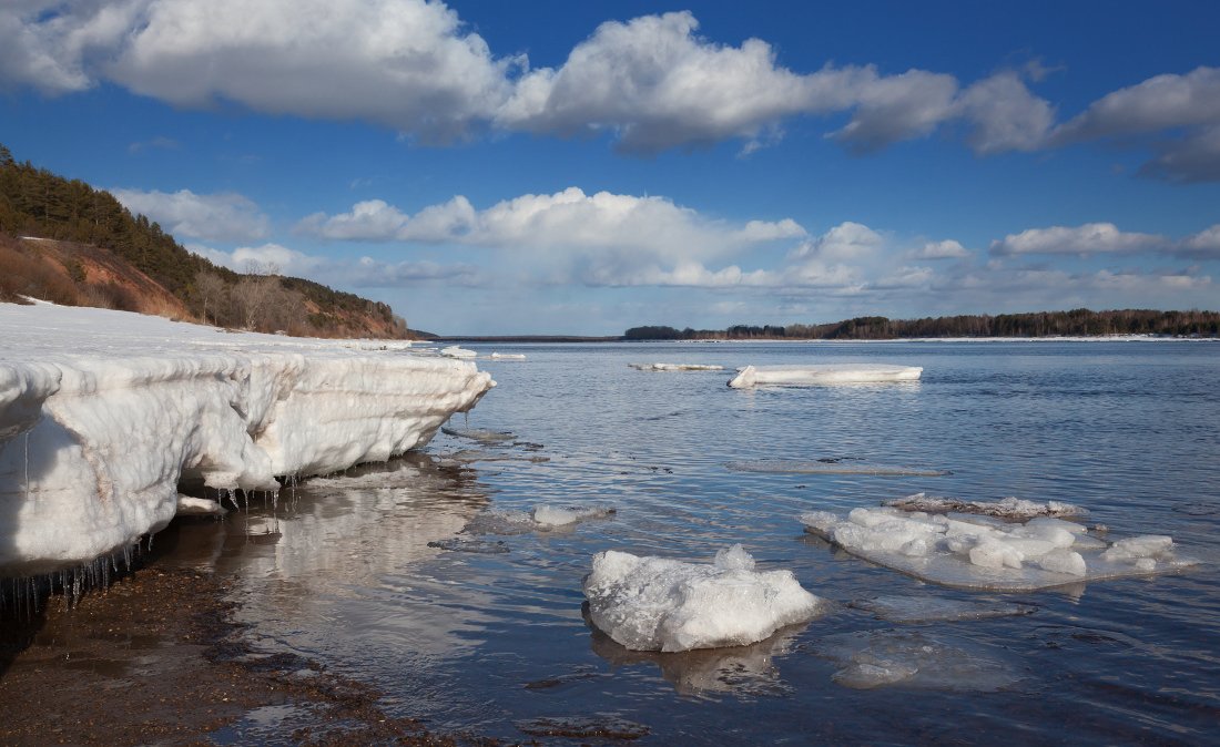 Река снег лес льдины облака отражения весна Кама, Георгий Машковцев