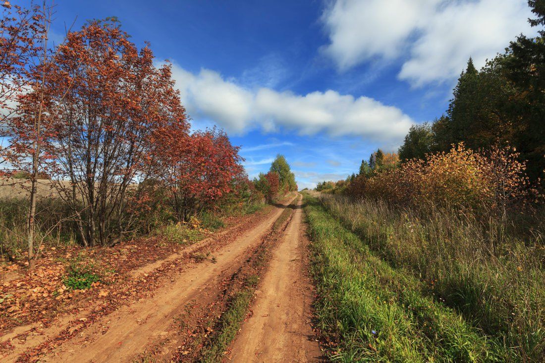 Дорога колея трава деревья лес осень облака небо, Георгий Машковцев