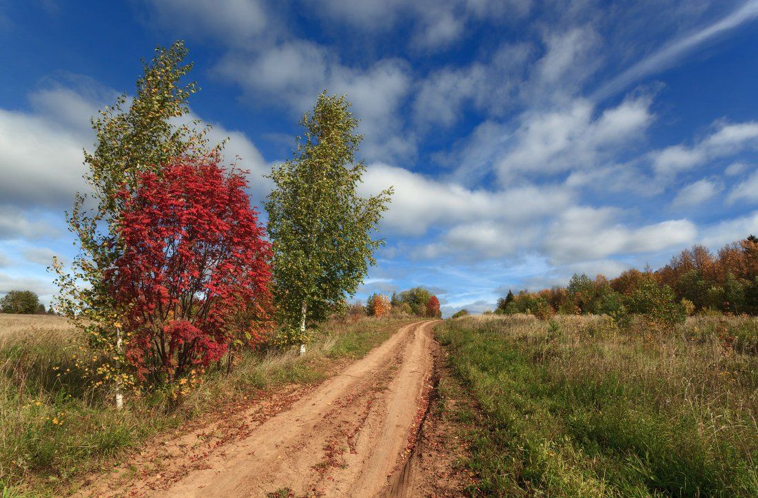 Дорога колея деревья лес облака краски осень, Георгий Машковцев