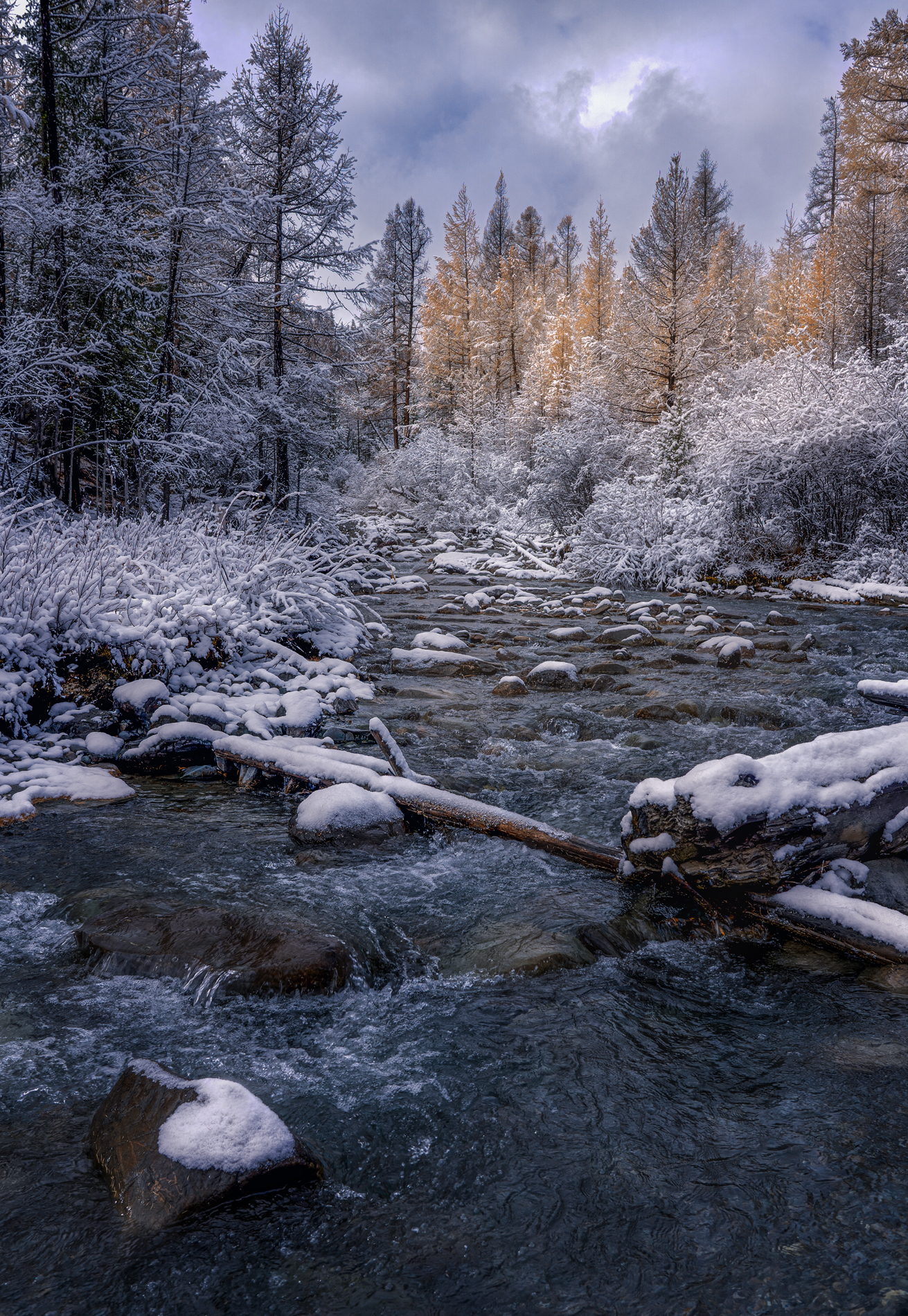 Олег, получилось неплохо. Хорошо передано предзимнее настроение — снежные деревья, бурлящая речка, игра света. Композиция удачная, детали чёткие. Уважаемо.