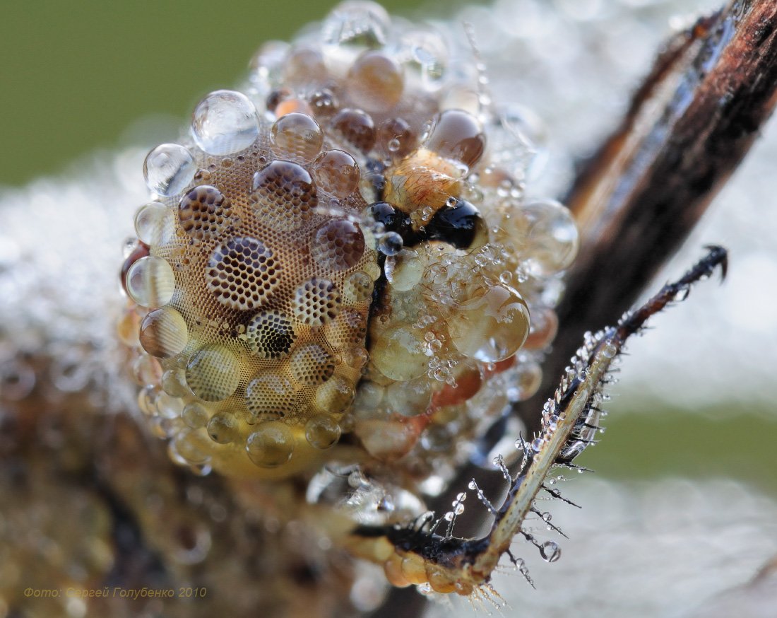 Стрекоза на ветке в росе. Крупный план:капли на фасетках глаза стрекозы.