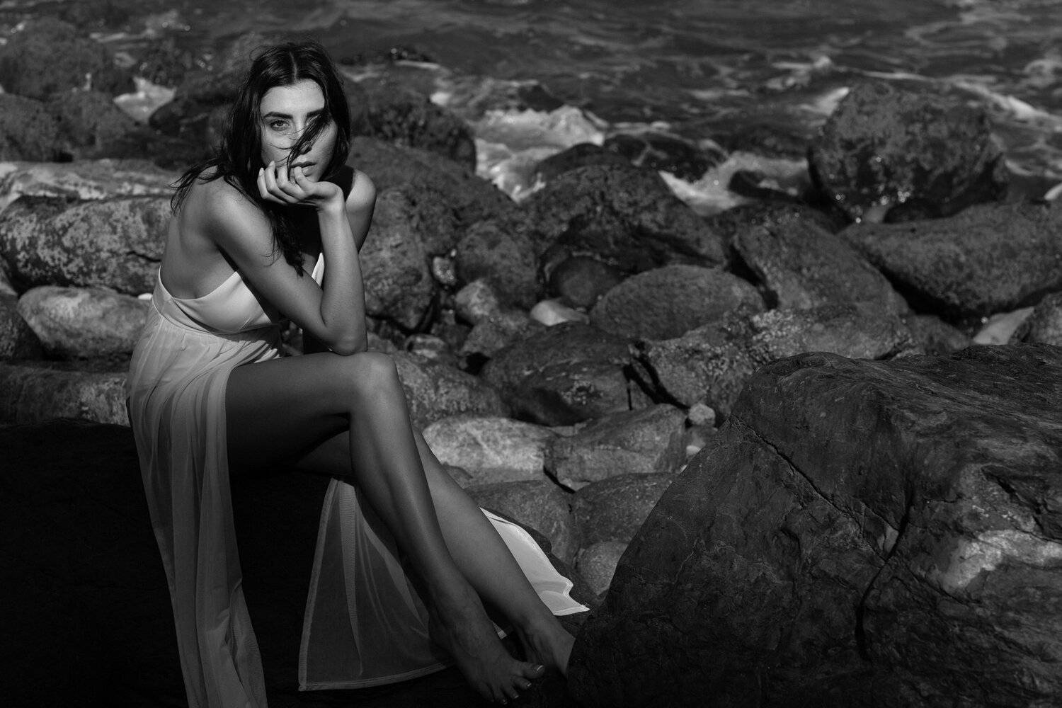 Ocean, rocks, spray, and mood.