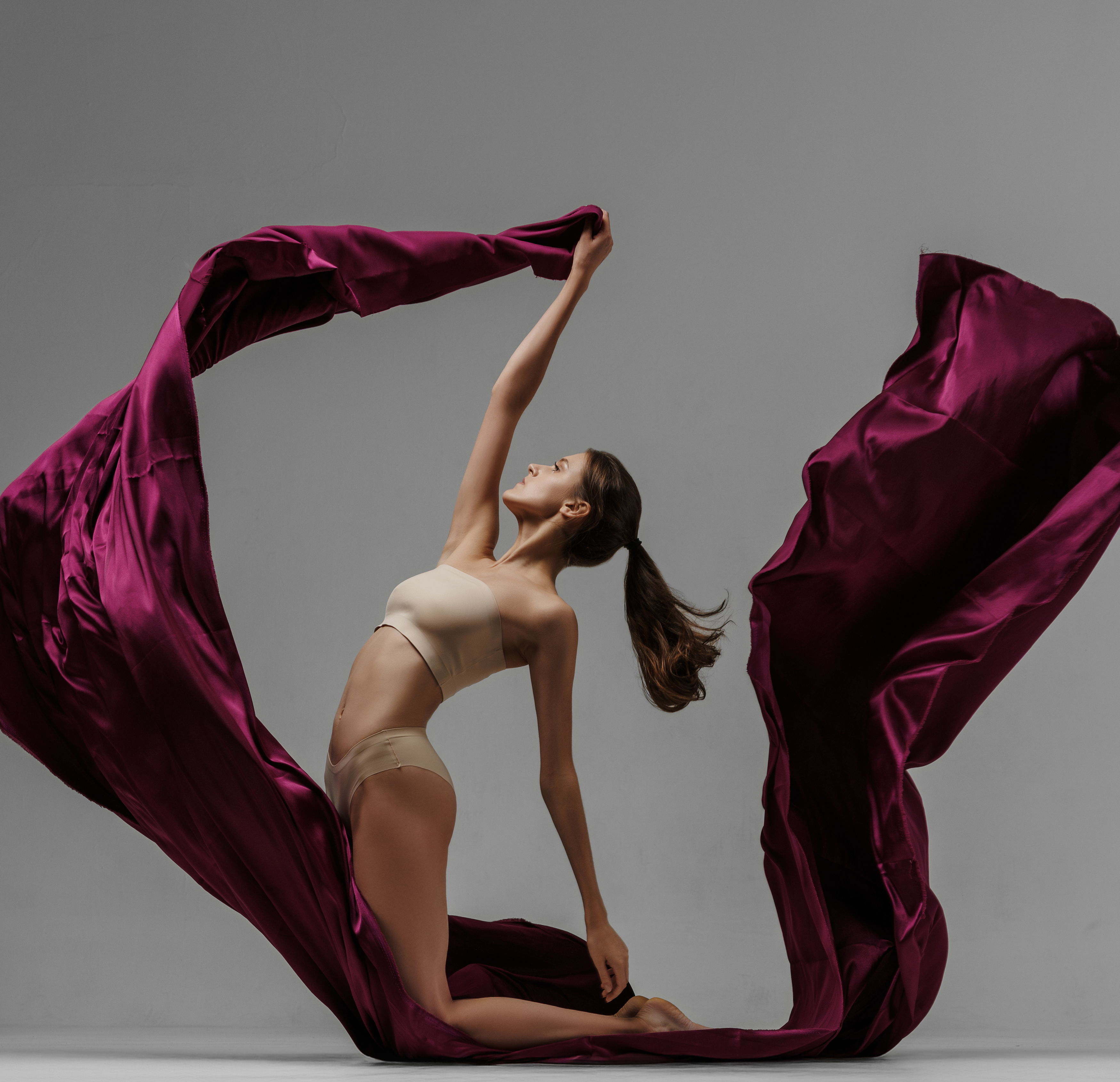 Студийный снимок модели Анастасии, запечатлённой в изящной, выразительной позе. Бордовая ткань, словно ожившая, обтекает фигуру, создавая ощущение движения и лёгкости. Нейтральный фон акцентирует внимание на силуэте и игре света на гладкой поверхности материала. Фотография передаёт атмосферу гламура и современной эстетики, подчёркивая грациозность и художественную выразительность образа. Работа Оксаны Горячевой.