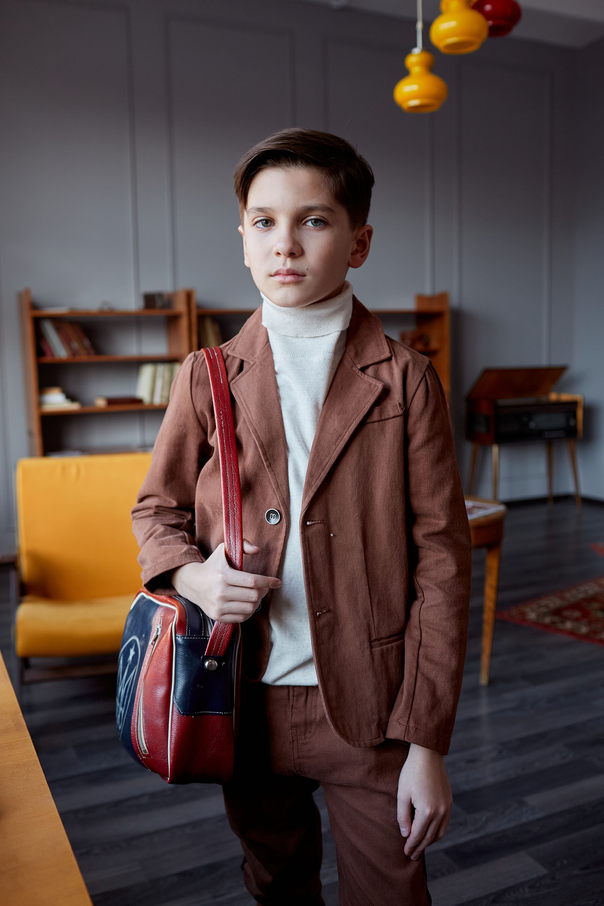 Мальчик в коричневом костюме с сумкой смотрит прямо — спокойно, уверенно, будто знает, куда идёт.