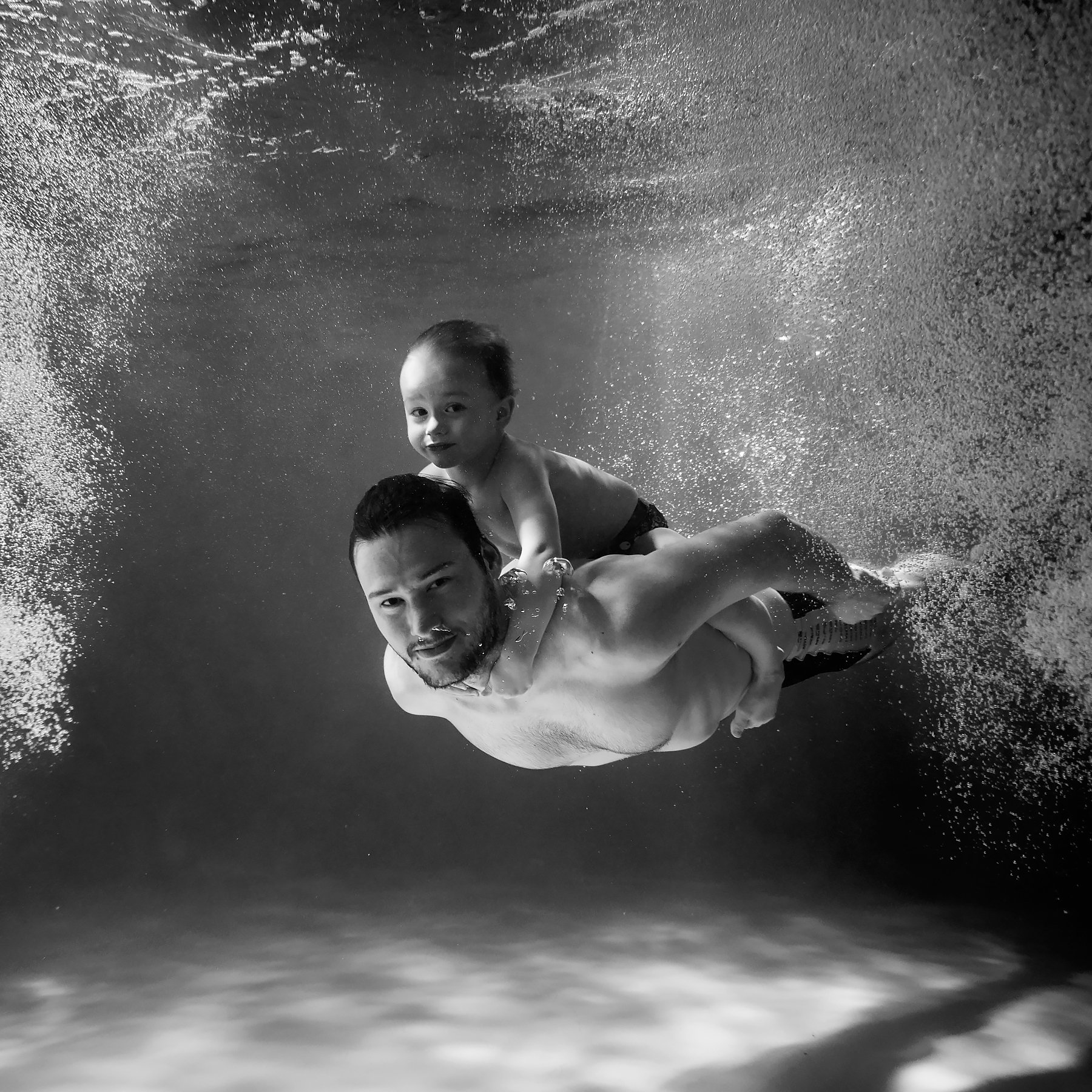 В кадре — мгновение, где время останавливается. Отец, с улыбкой на лице, несёт ребёнка под водой, словно в невесомости. Свет, проникающий сквозь поверхность, рисует на дне тёплые блики, а пузыри, поднимающиеся вверх, словно символизируют радость и беззаботность. Фотограф Слава Гребенкин запечатлел не просто сцену, а глубокую связь — ту, что не нуждается в словах. Это снимок о любви, доверии и том, как родительская забота может быть одновременно сильной и лёгкой.